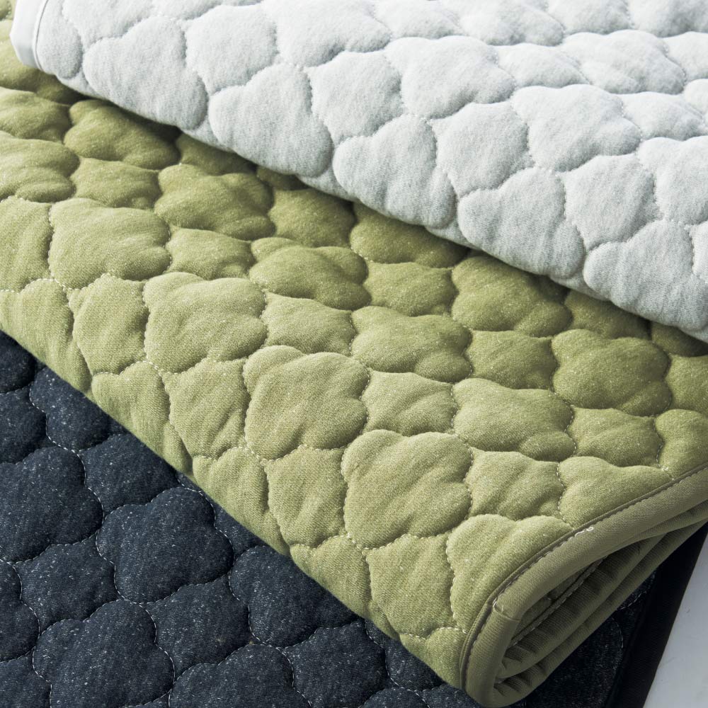 カジュアル&リラックスが持ち味のメランジスウェット生地に、キルトステッチを施してフワサラの風合いに仕上げました。ニュアンスカラーと曲線使いのステッチで、ソファをお気に入りのリラックス空間に。抗菌防臭・防ダニ、丸洗いの清潔機能はそのままに、杢調の生地デザインと裏地の色を新しくしました。