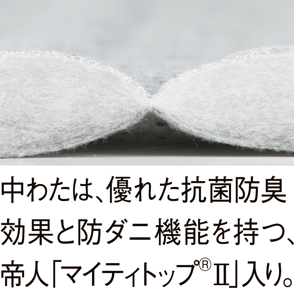 帝人「マイティトップ(R)II」入りで、細菌の増殖を抑制し、抗菌防臭効果を発揮します。一般の中わたと比較してダニ忌避効果があり、お子さまがいるご家庭も安心です。