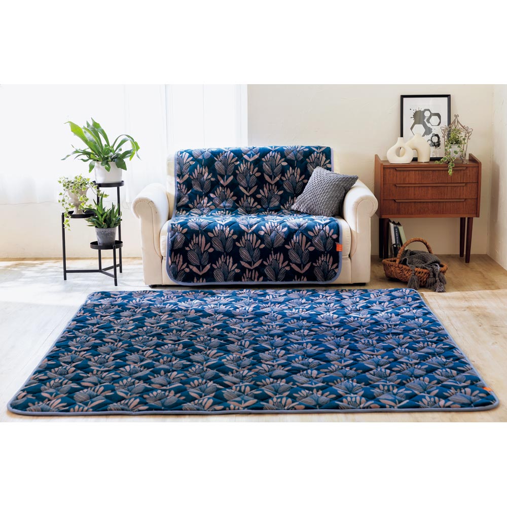あたたかさで人気の「ヒートループ(R)ハイパー」のファブリックを、「ELLE HOME(R)」が監修。「ELLE」の豊富なデザインソースの中からボタニカル柄を選び、エスプリの効いたラグに仕上げました。表地は肌ざわりがよい起毛素材で、キルティング加工によりふんわりとしています。厚さ約1.5cmで、座ったり寝転んだりしているだけで暖かくなるので、電気代の節約にも貢献。インテリア性と機能性に優れたスペシャルなラグが、この冬の心地よい空間をつくります。dinosが企画した、dinosでしか購入できないアイテムです。同シリーズのソファカバーと素敵にコーディネートできます。