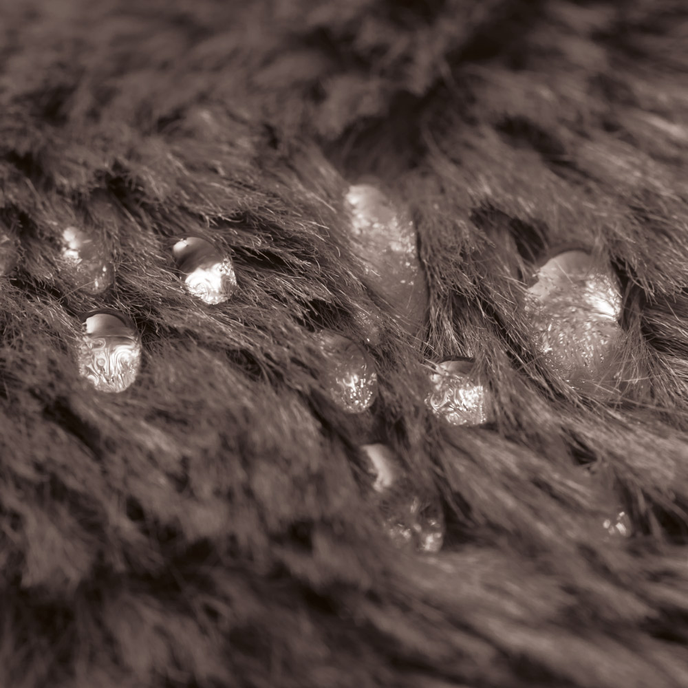 ふわふわのファー素材に、飲み物をこぼしてもサッと拭き取れるお手入れ簡単な、はっ水加工を施しました。