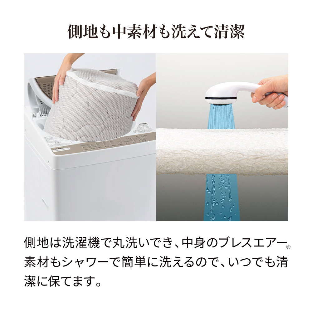 側カバーは洗濯機で丸洗いOK。さらに中素材もシャワーで洗えて清潔にお使いいただけます。