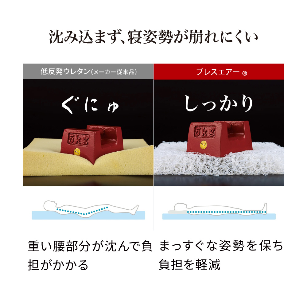 つらい肩腰を力強く支えるブレスエアー(R)敷布団の上位シリーズ。やわらかな寝心地・サポート力・寝返りのしやすさにとことんこだわった、高級旅館のような寝心地です。