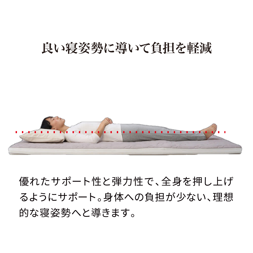 肩や腰をしっかり支え、まっすぐな良い寝姿勢に導き、睡眠中の身体の負担を軽減してくれます。