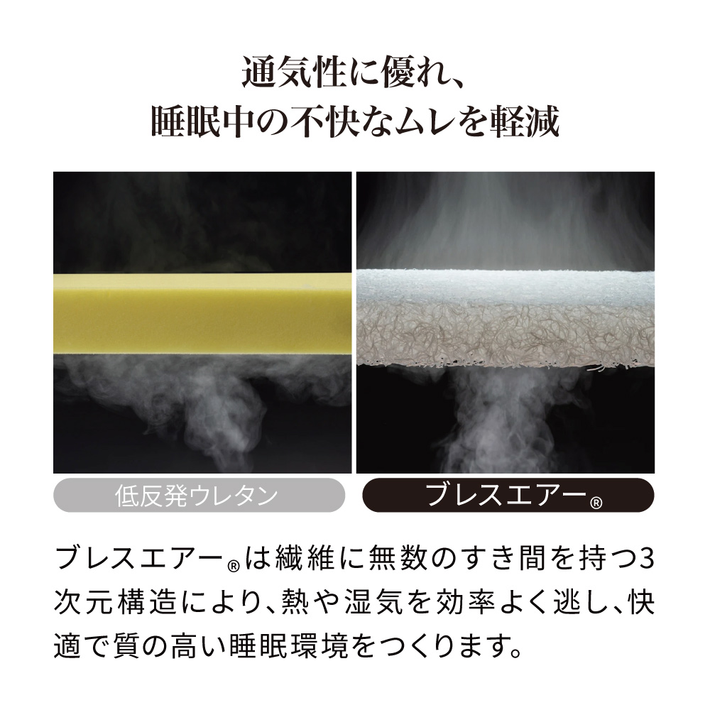 • 上層はグラデーションタイプのブレスエアー(R)、下層にしっかりタイプのブレスエアー(R)の贅沢なボリューム感。まるで雲に支えられているかのように軽やかでラグジュアリーな寝心地です。