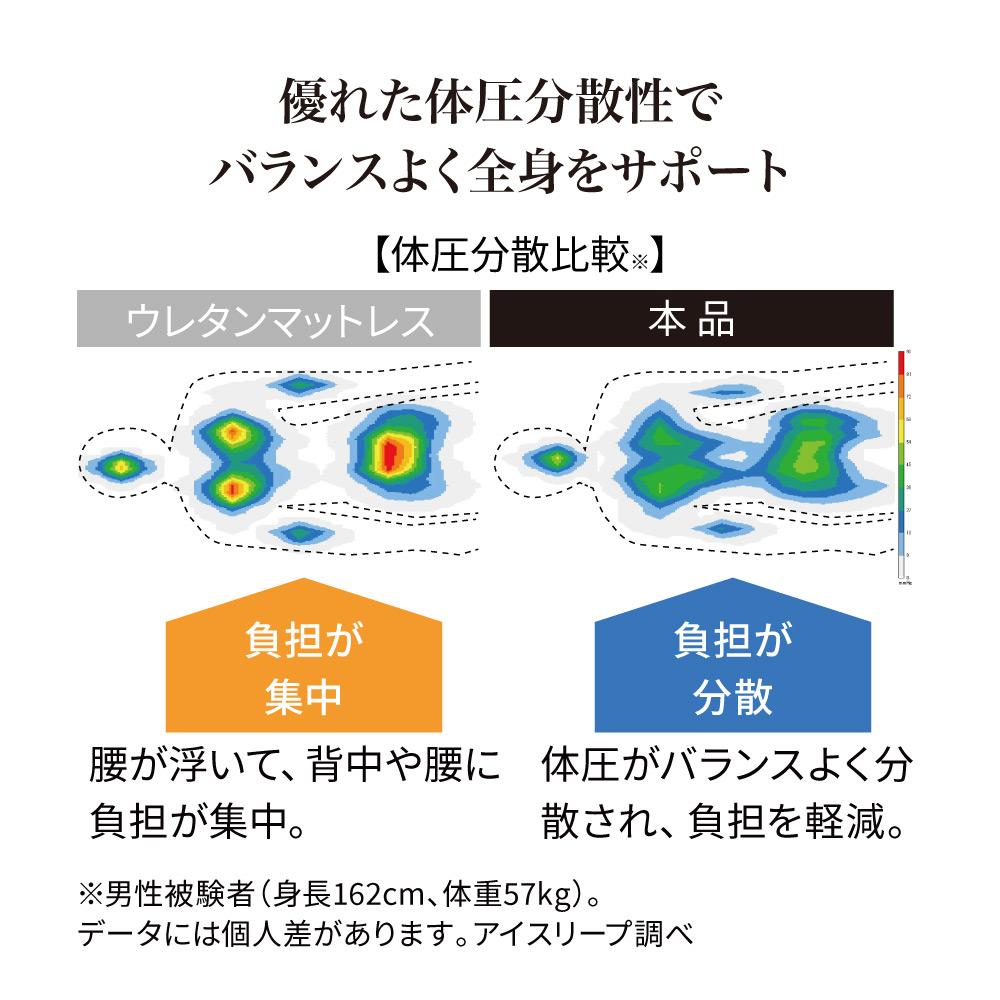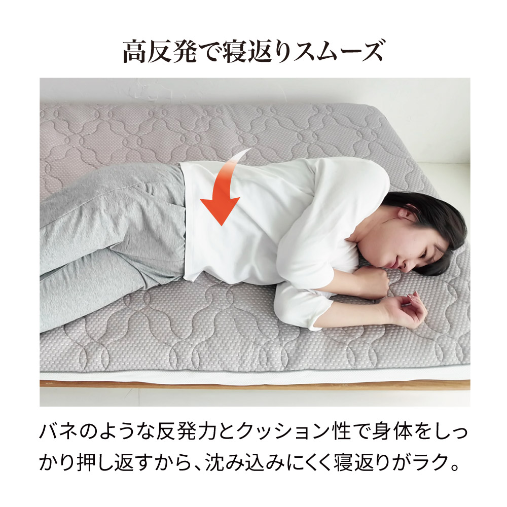 • 特殊な3次元網状態繊維により、体重がかかっても沈みこまず押し返し、重さのかかりやすい腰と肩をしっかり支えます。