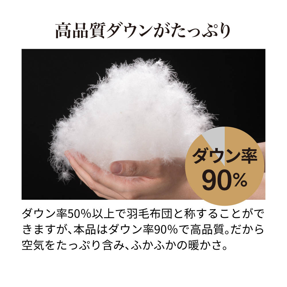 ダウンはフェザーに比べて軽量で、繊維の隙間に暖かい空気をたっぷり含みます。通常、ダウン率50%で羽毛布団と呼べるところ、本品はダウン率90%の高品質羽毛布団なので、ふんわり軽く暖かな掛け心地になります。