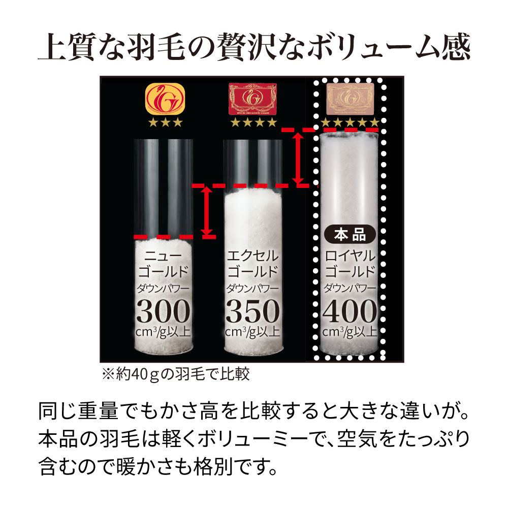 ゴールドラベルは、日本羽毛製品協同組合が発行する品質推奨ラベルの中でも、高い水準に合格した羽毛布団にのみ発行されます。本品はその中でも5つ星・ロイヤルゴールドラベルを取得しており、同じ重量でもかさ高性に富んだ本品の羽毛は、軽くボリューミーで空気をたっぷり含むため暖かさも格別です。