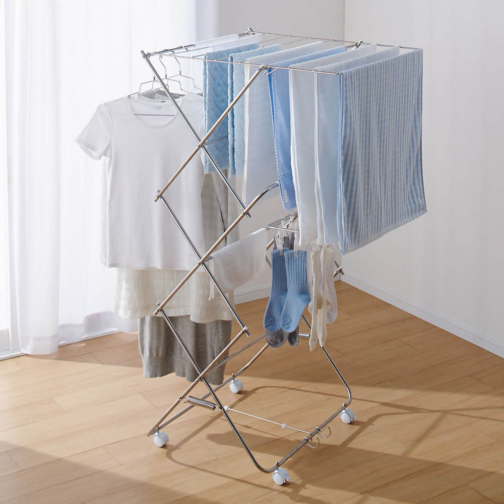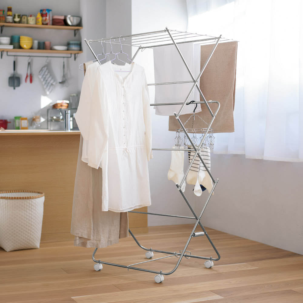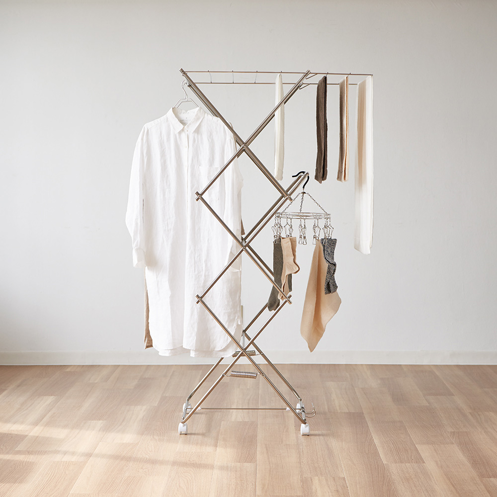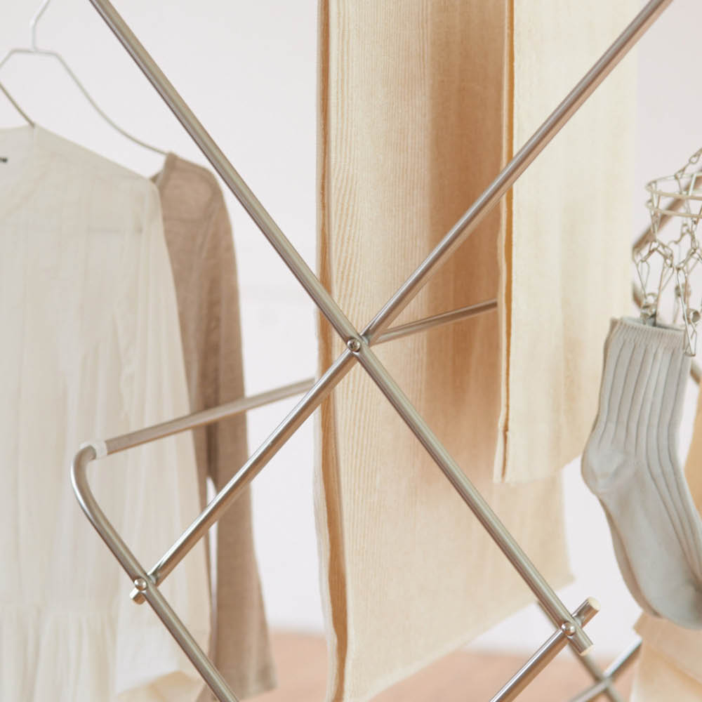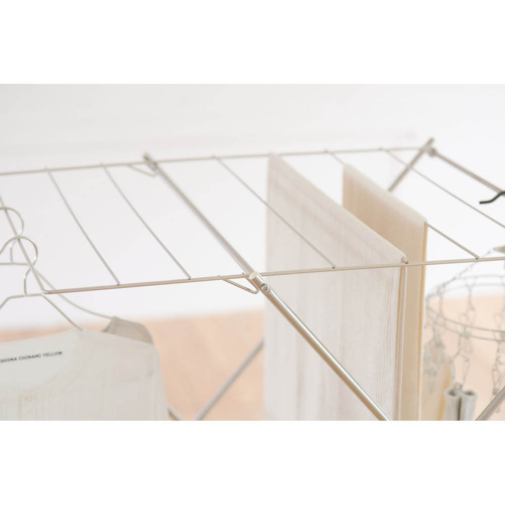中段バーは斜め設計で、タオルが掛けやすく便利。シャツやワンピースも重ならず、風通しよく干せます。ピンチハンガーもそのまま使えて、干し分けしやすいのも嬉しいポイント。たくさん干してもスッキリまとまる、使い勝手のいい室内物干しです。