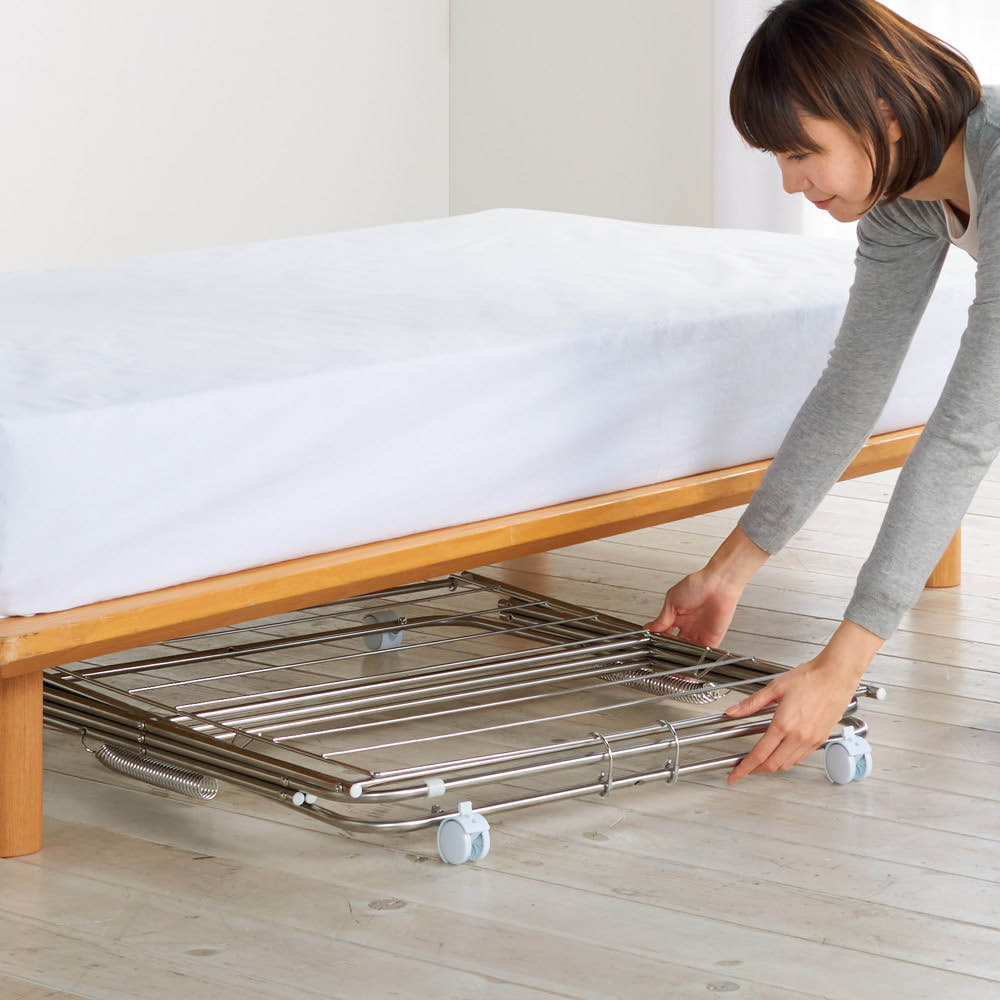 使わないときは、ゆっくり落とすように下げて、ストッパーを掛けて収納。高さ約9cmになるので、ベッドの下、家具の隙間などに収納できます。