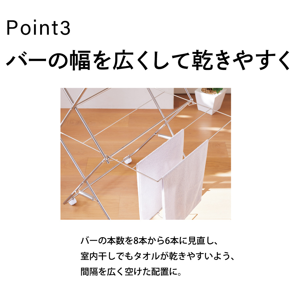 従来品からタオルバー部分の本数を見直しました。1本1本の間隔を空けたことにより、風が通りやすく、室内干しでもより乾きやすくしました。