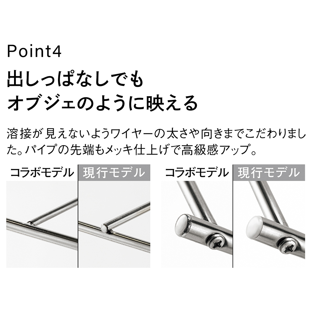 細かいところまでこだわりを。もともと日本製で国内の職人さんが手作業で仕上げていましたが、溶接方法を見直すことで、よりすっきりと美しい仕上げに。パイプ先端の保護キャップも白からメッキ仕上げにすることで一体感を出し、高級感もアップしました。