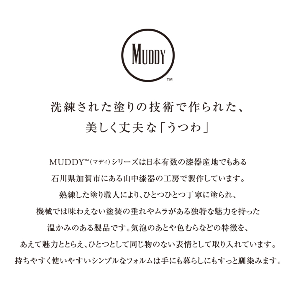 日本有数の漆器の産地、石川県加賀市。その歴史ある山中漆器の工房で、MUDDY(マディ)シリーズは生まれました。熟練の塗り職人が、一つひとつ丁寧に手作業で仕上げるMUDDYの器。機械では決して再現できない、塗装の垂れやムラが、製品一つひとつに温もりと独特の表情を与えています。あえて残した「個性」。それがMUDDYの美しさ