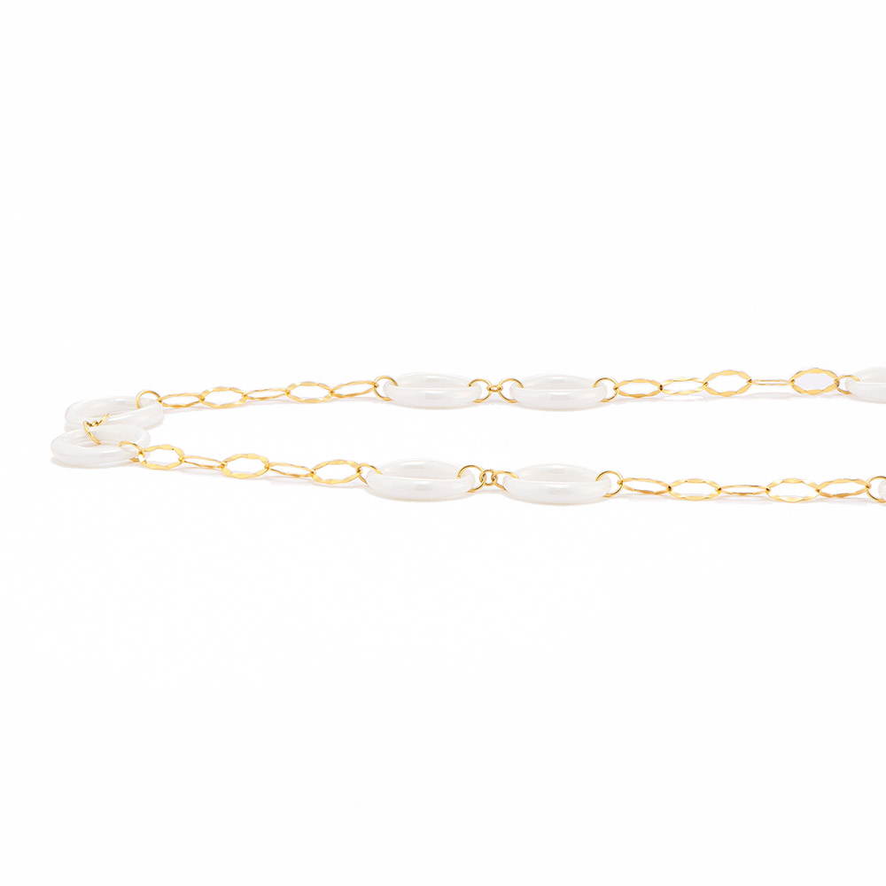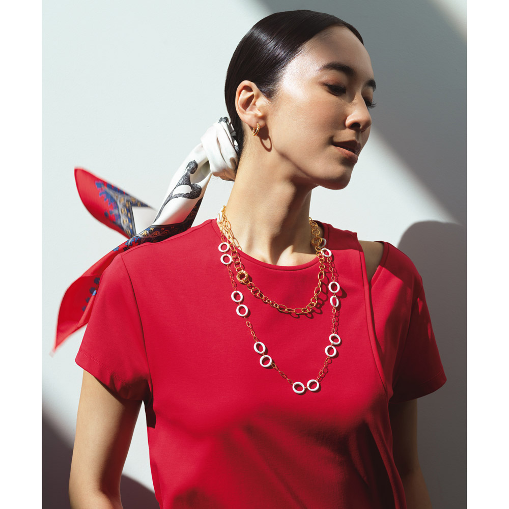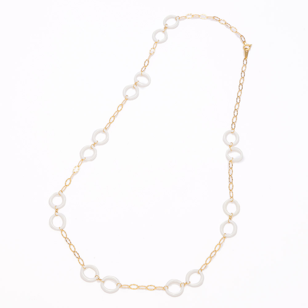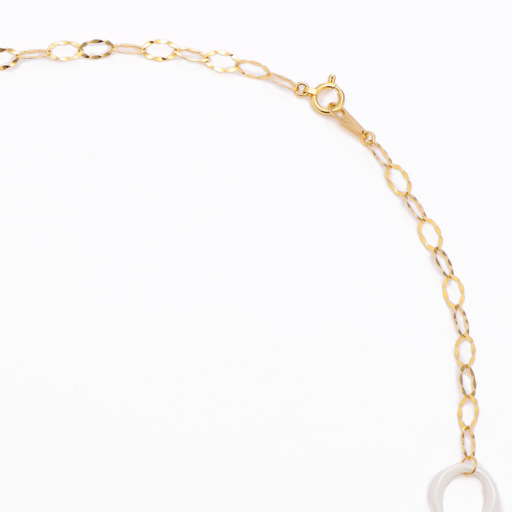 ハイブランドのジュエリーや時計にも用いられ注目を集めるセラミック。耐久性が高くなめらかな肌触りの新素材です。丸みのあるサークル形のホワイトセラミックにYGチェーンが爽やかなモード感を醸すネックレス。トレンドに敏感な香港製。