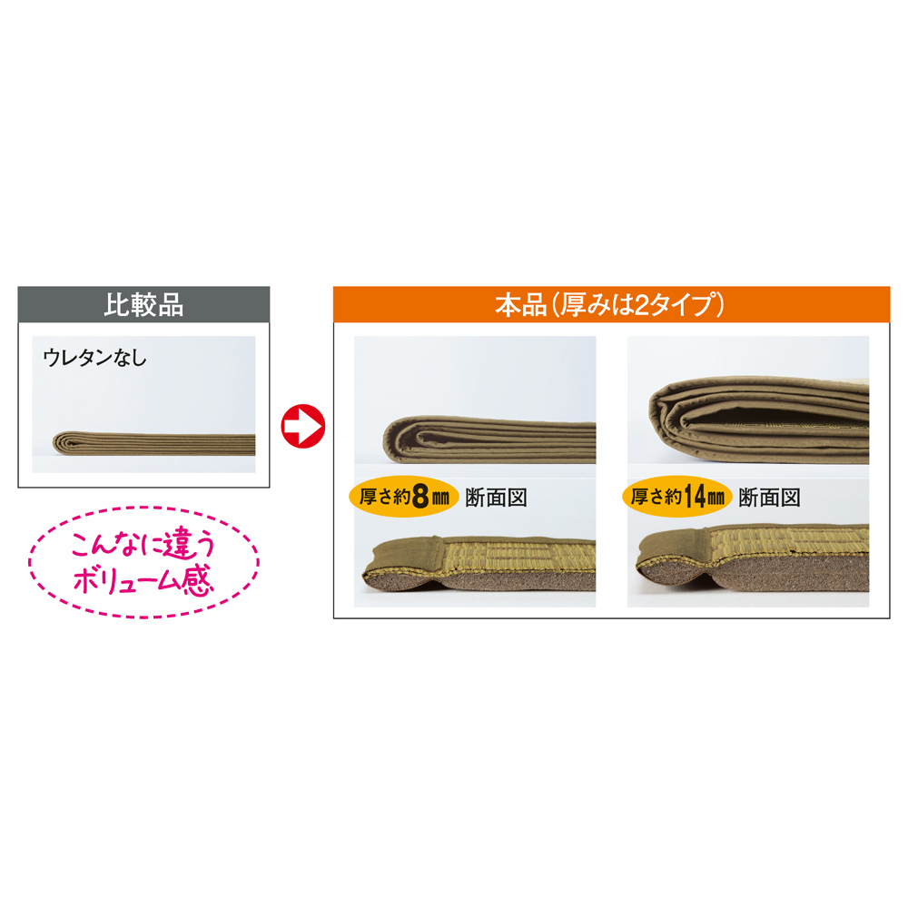 厚さはボリューム満点の14mmと、適度な厚さの8mmから選べます。空気清浄力&消臭作用のあるい草を、年間使えるようにしたふっくらボリュームタイプ、ぜひお試しください。