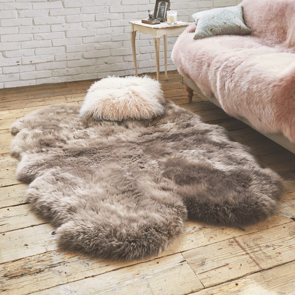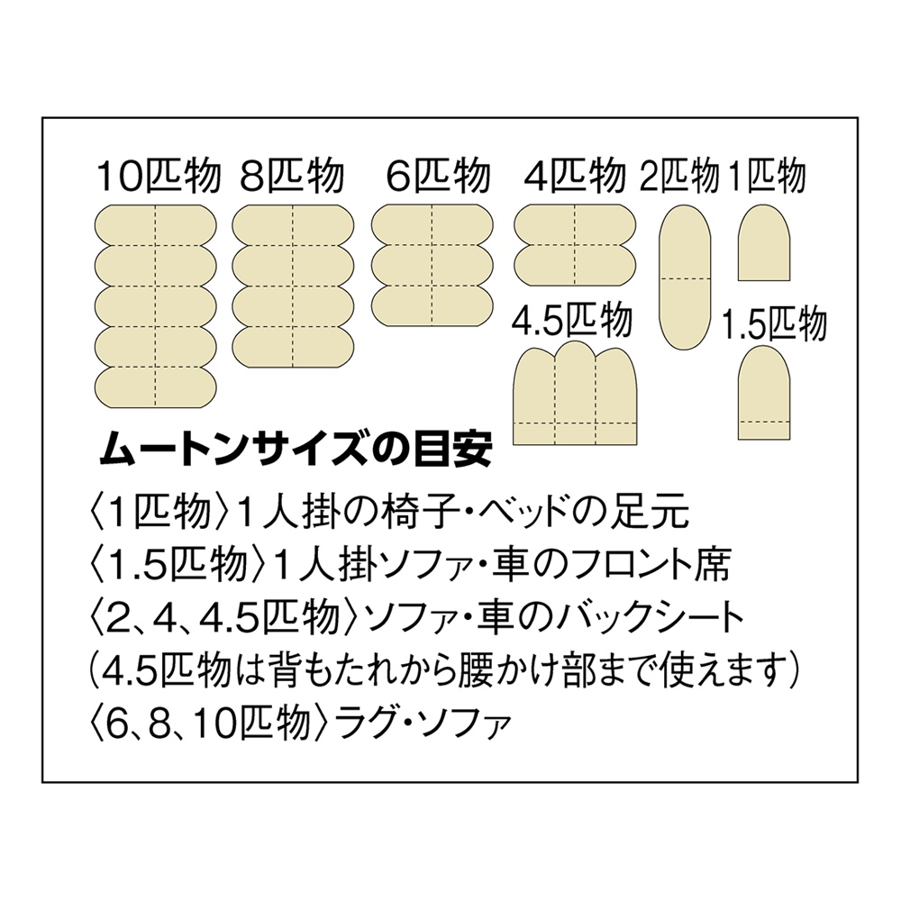 春先に生まれ、強い日差しの影響が少ない時期に取った、ニュージーランド産のスプリングラムを使用。高密度で柔らかな約50mmの毛足。包み込まれるようなボリューム感と心地よい肌触りは、きっと家族のお気に入りに。天然の吸放湿性があるので、夏はサラッとしていて、冬は暖か暖か。一年中快適にお使いになれます。もちろん、ホットカーペットや床暖房のお部屋にも使用できます。思わずうっとりする、高密度で柔らかな毛足約50mmのボリューム。どんなテイストにも上品に馴染むちょっと大人なカラー。ラグジュアリーなお部屋から、ナチュラル系のお部屋まで、使い方も広がります。1匹物~6匹物まで用途に応じてお選びください。