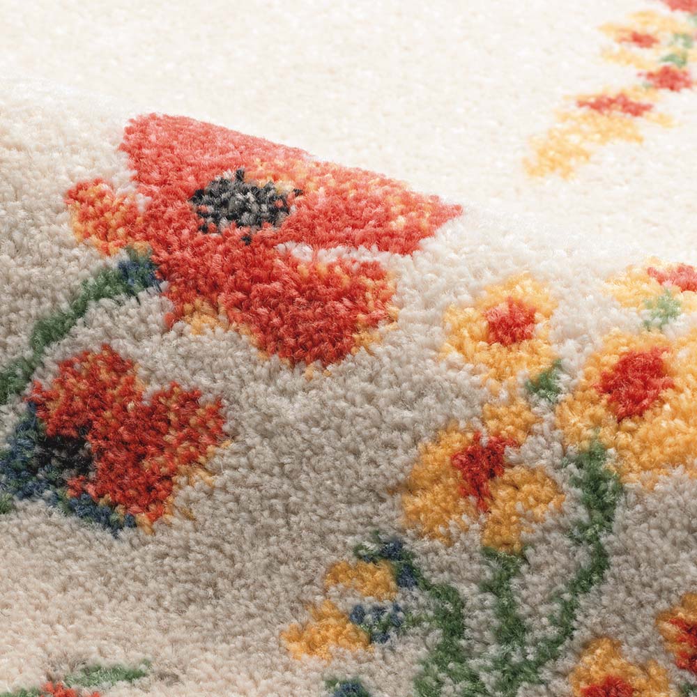 のびのびと咲くリアルな花々を、アシンメトリーに配した華やかなデザイン。美しい発色としっかりとして滑らかな表面感は、ベルギー製ウィルトン織りならでは。毎日お花畑の中にいるような、気分をアップさせてくれるラグです。遊び毛が出にくく、お手入れも簡単。防炎性能に優れた証の安心の防炎マーク付きです。