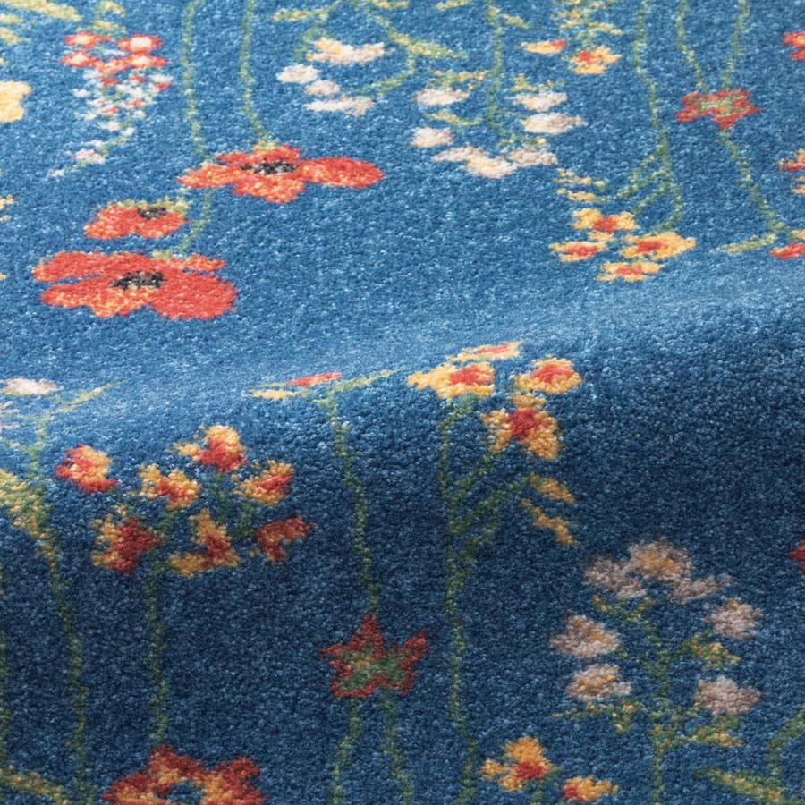 のびのびと咲くリアルな花々を、アシンメトリーに配した華やかなデザイン。美しい発色としっかりとして滑らかな表面感は、ベルギー製ウィルトン織りならでは。毎日お花畑の中にいるような、気分をアップさせてくれるラグです。遊び毛が出にくく、お手入れも簡単。防炎性能に優れた証の安心の防炎マーク付きです。