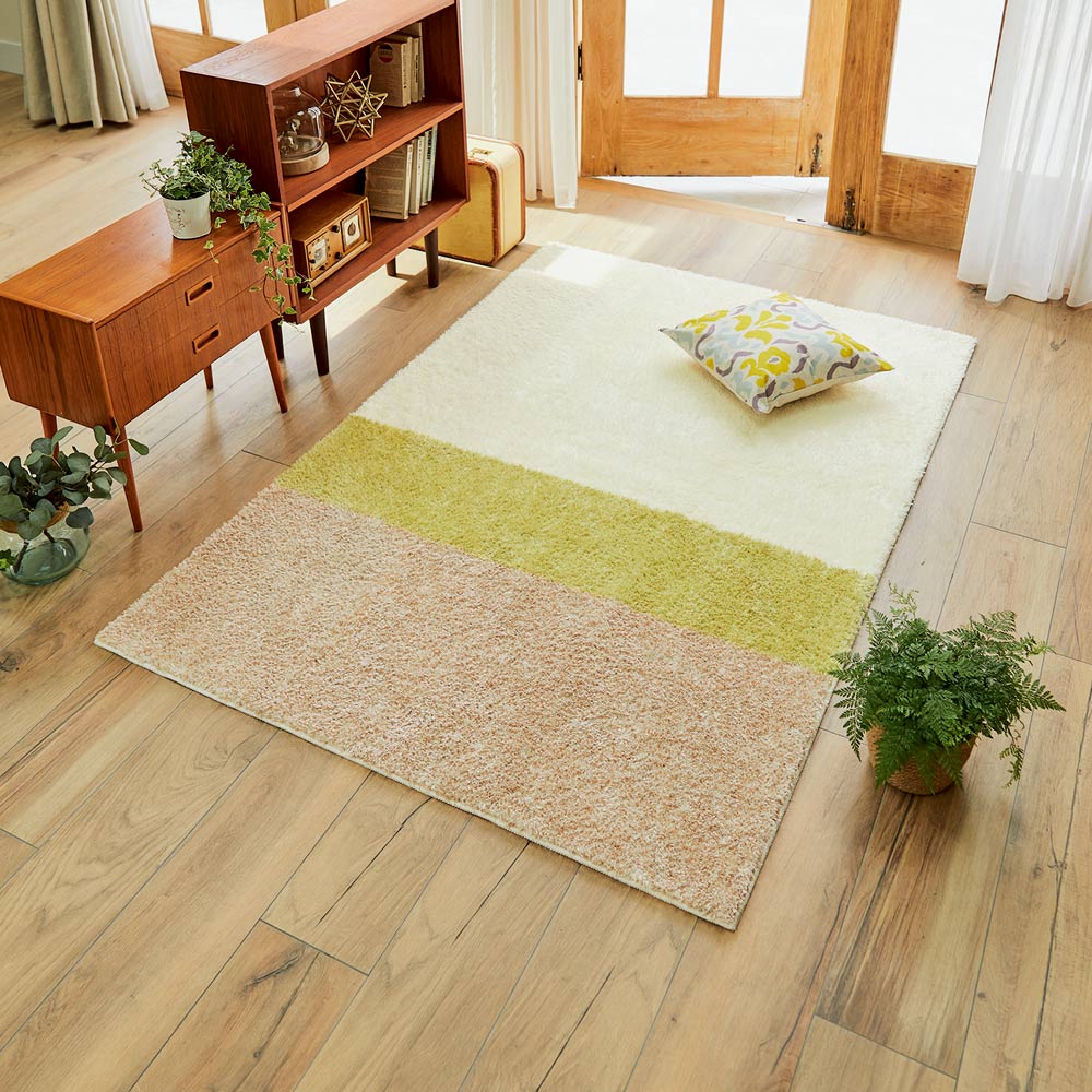しなやかな長い毛足と、弾力のある短い毛足を組み合わせた、表面はふわふわ、踏み心地はしっかりのシャギーラグです。●人気のボーダー柄タイプ&ニュアンスのある無地タイプ