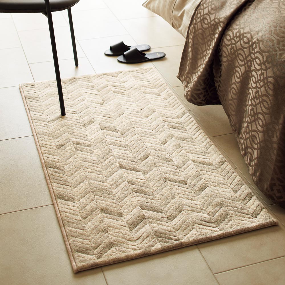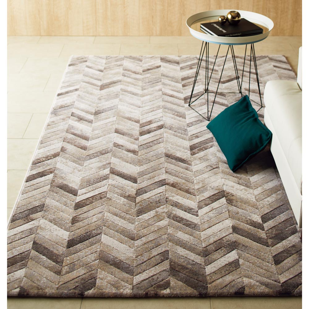 モダンなインテリアによく似合うヌビアンラグは、ベルギー製の高密度ウィルトン織りのラグ。濃淡で表現されたヘリンボーン柄は、丁寧に糸貫加工が施されて立体感のある仕上がりに。高密度ならではのしっかりした踏み心地で飽きのこない上質なラグです。
