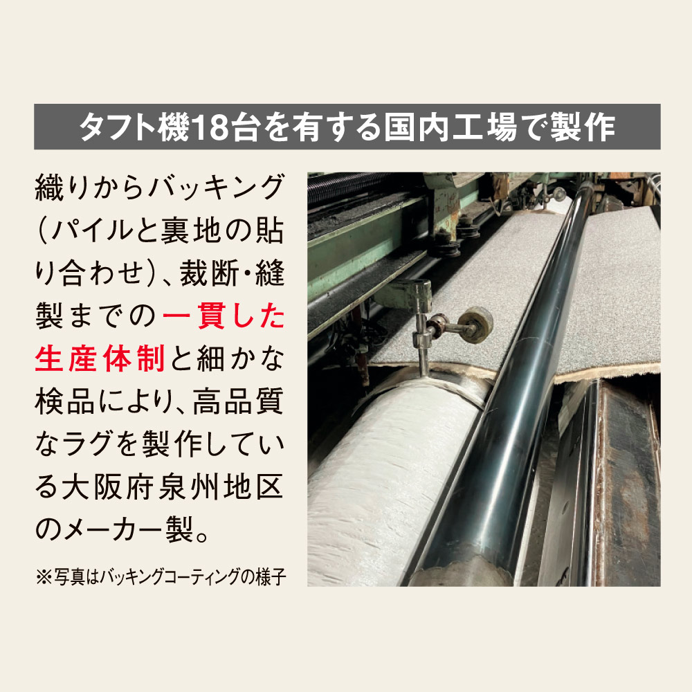 織りからバッキング(パイルと裏地の貼り合わせ)、裁断・縫製までの一貫した生産体制と細かな検品により、高品質なラグを製作している大阪府泉州地区のメーカー製。【ポイント2】天然素材のウール100%