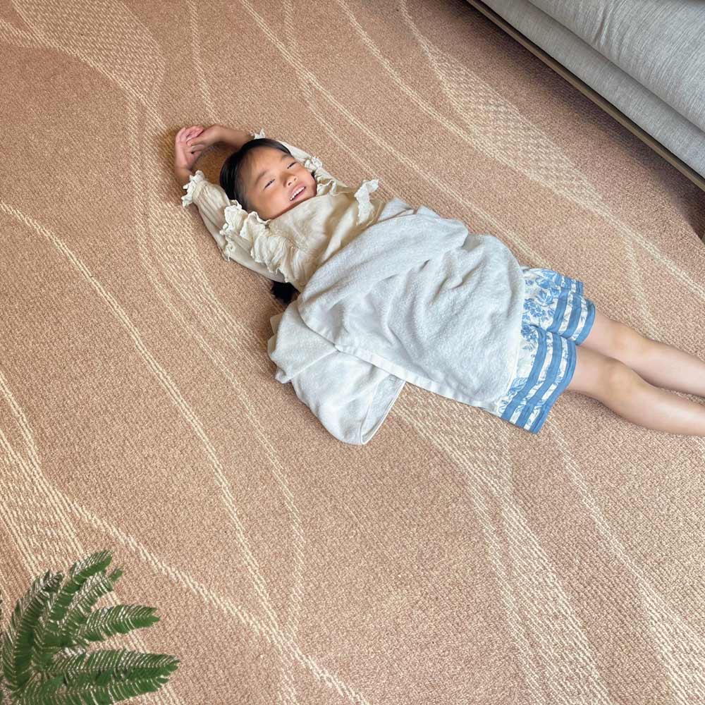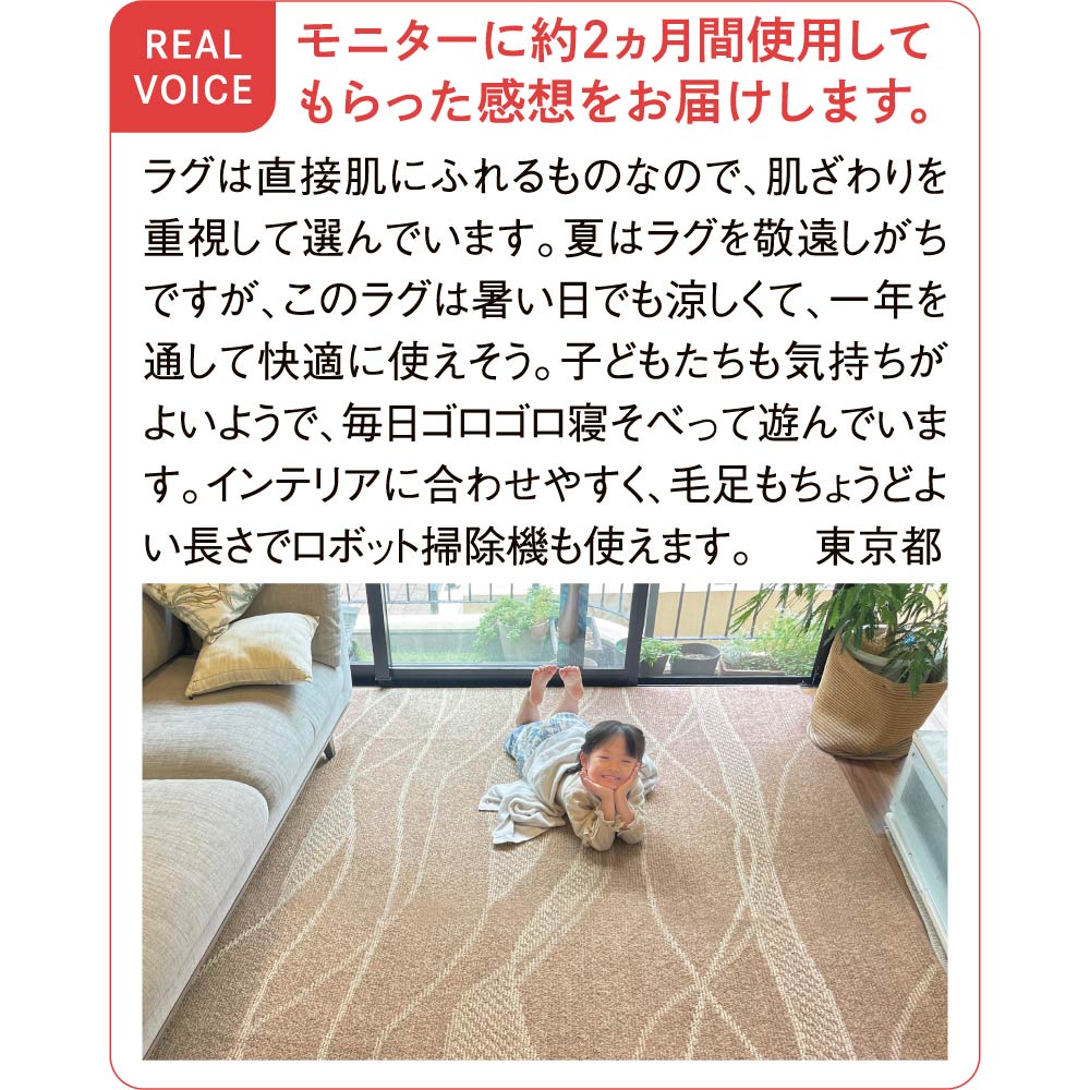 ラグは直接肌にふれるものなので、肌ざわりを重視して選んでいます。夏はラグを敬遠しがちですが、このラグは暑い日でも涼しくて、一年を通して快適に使えそう。子どもたちも気持ちがよいようで、毎日ゴロゴロ寝そべって遊んでいます。インテリアに合わせやすく、毛足もちょうどよい長さでロボット掃除機も使えます。 東京都商品画像の説明