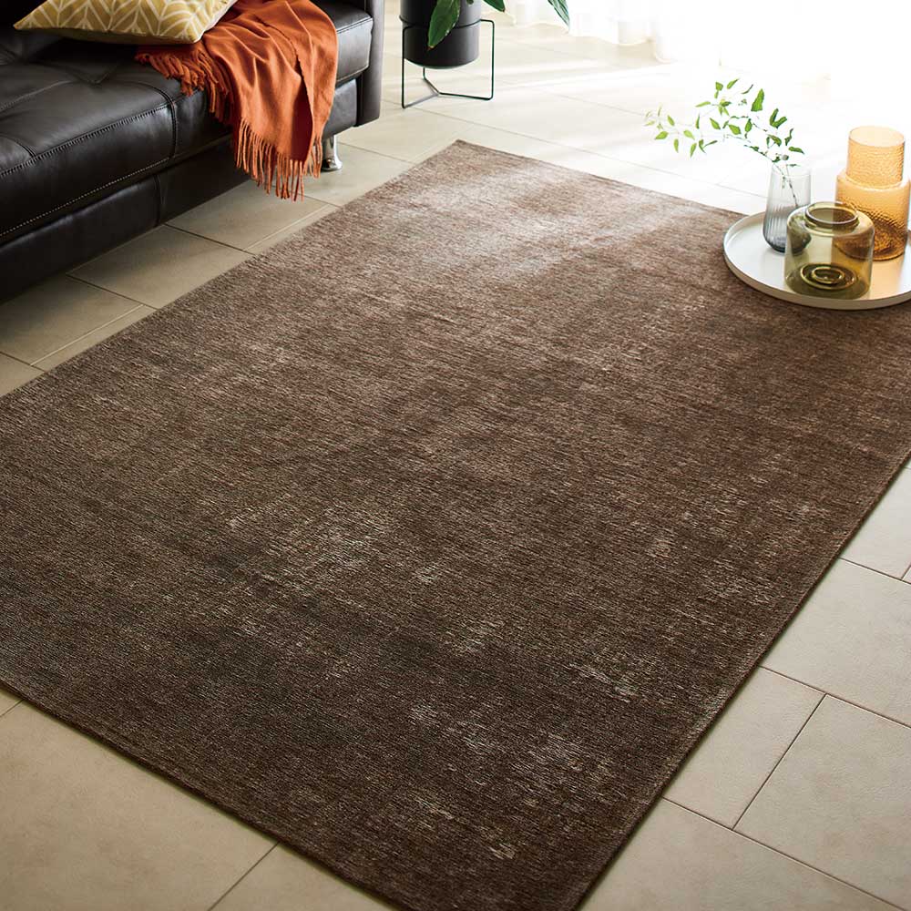 太く柔らかい綿毛のようなシェニール糸を緯糸に、色糸を縦糸にしジャガード織機で織り上げたラグです。擦れ調の色合いを濃淡ミックスのシェニール糸を使って織りで表現しました。