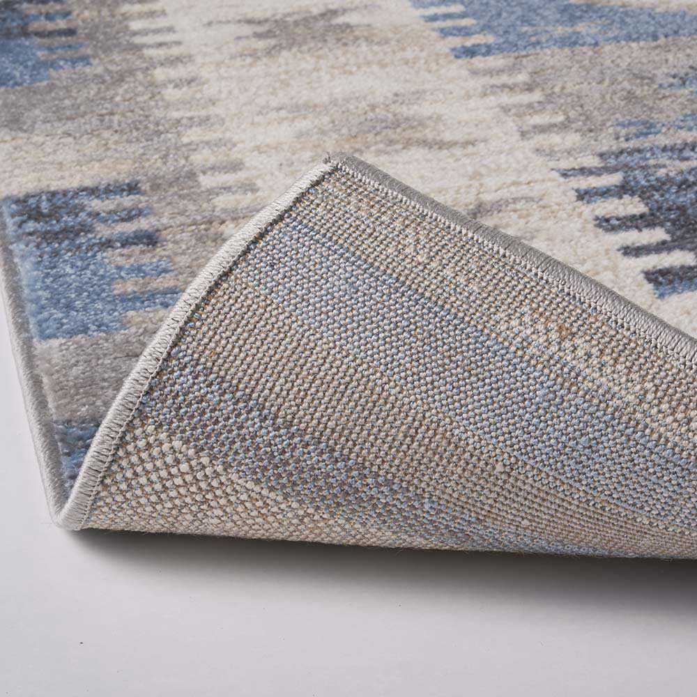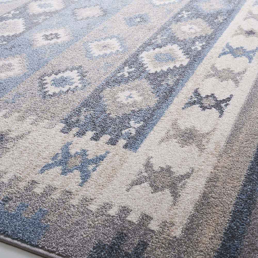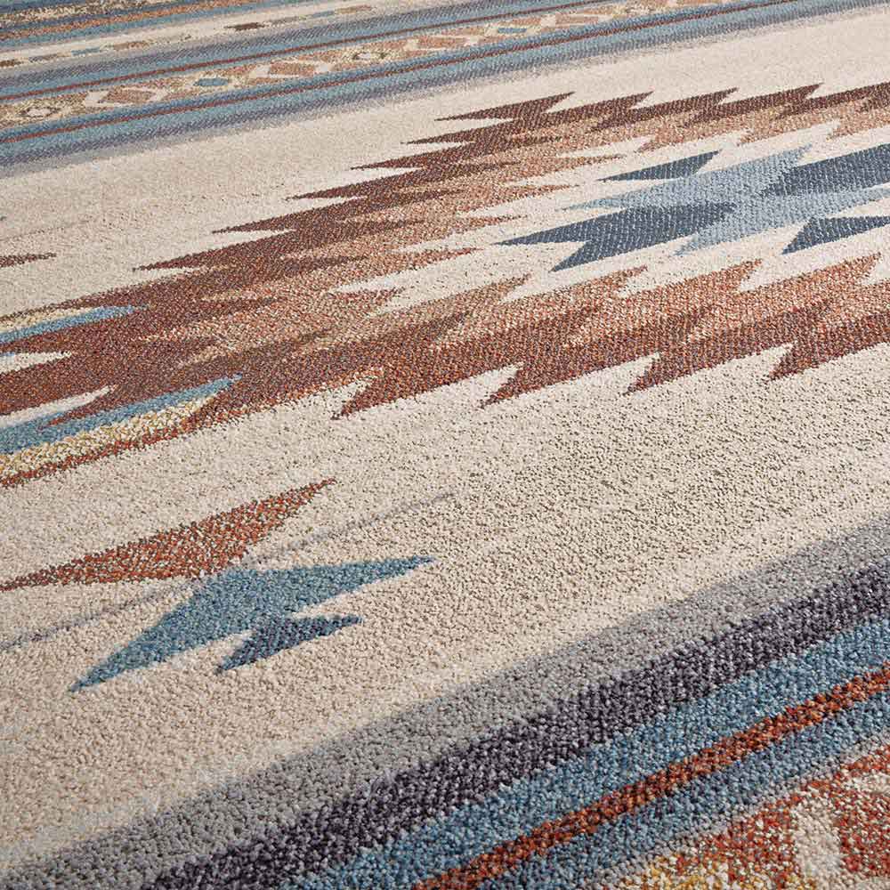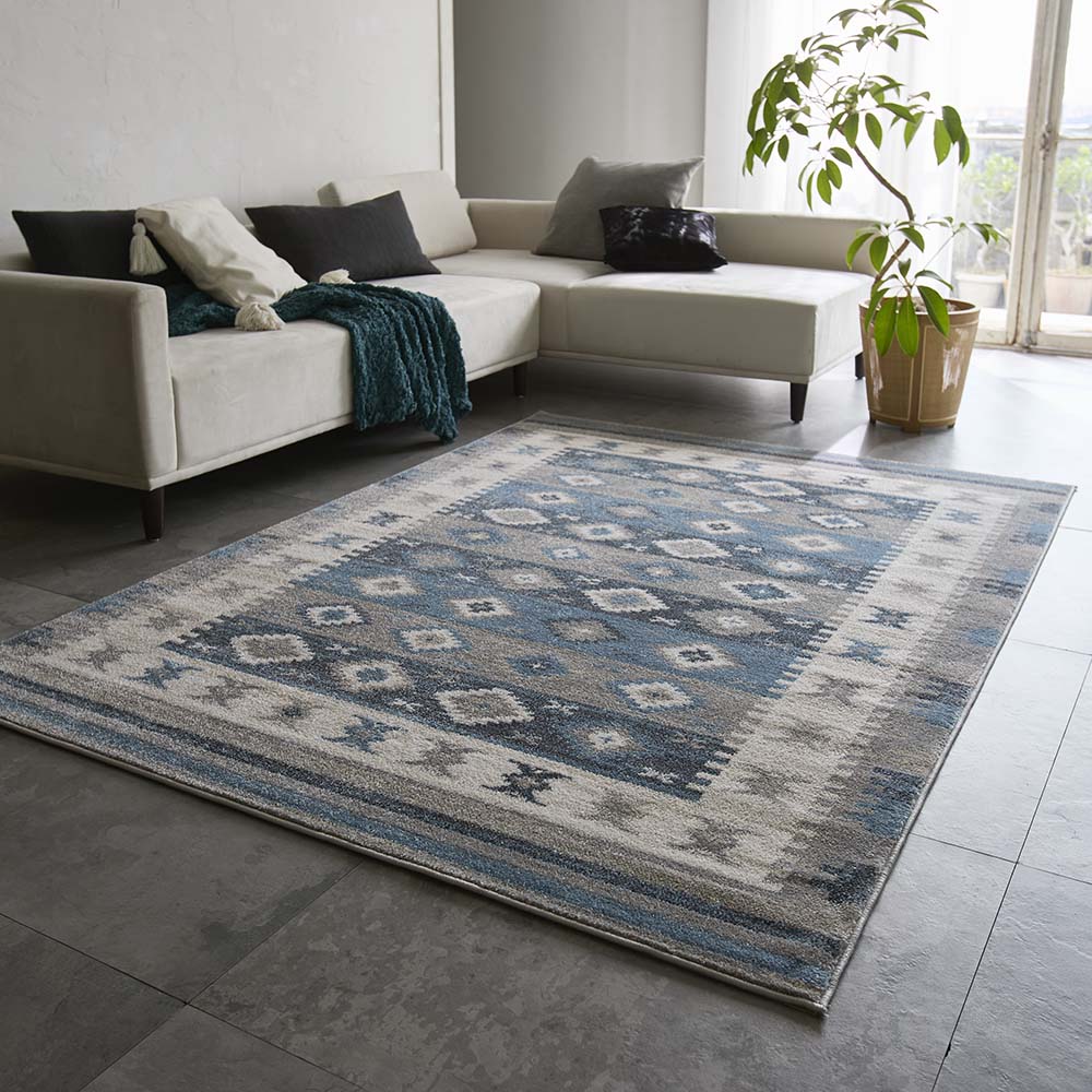 ネイティブアメリカンをモチーフにした幾何学的トライバル柄のウィルトン織りラグ。軽くて耐久性に優れたポリプロピレン100%、湿気を取り込みにくく、汚れが付きにくいのが特長。フリーゼセット(撚り)を施し、柔らかい肌触りに仕上げています。