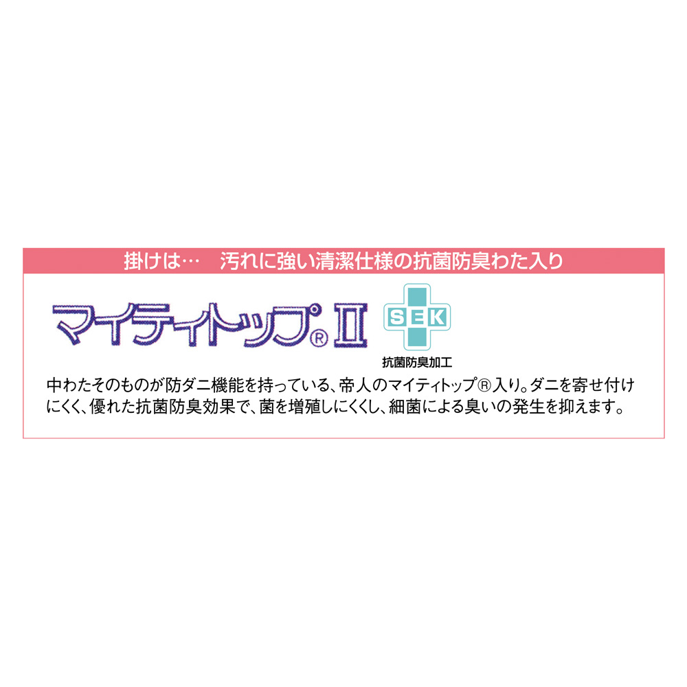 中わたは防ダニ機能を持っている、帝人のマイティトップ(R)2入り。ダニを寄せ付けにくく、優れた抗菌防臭効果で、菌を増殖しにくくし、細菌によるニオイの発生を抑える効果が期待できます。
