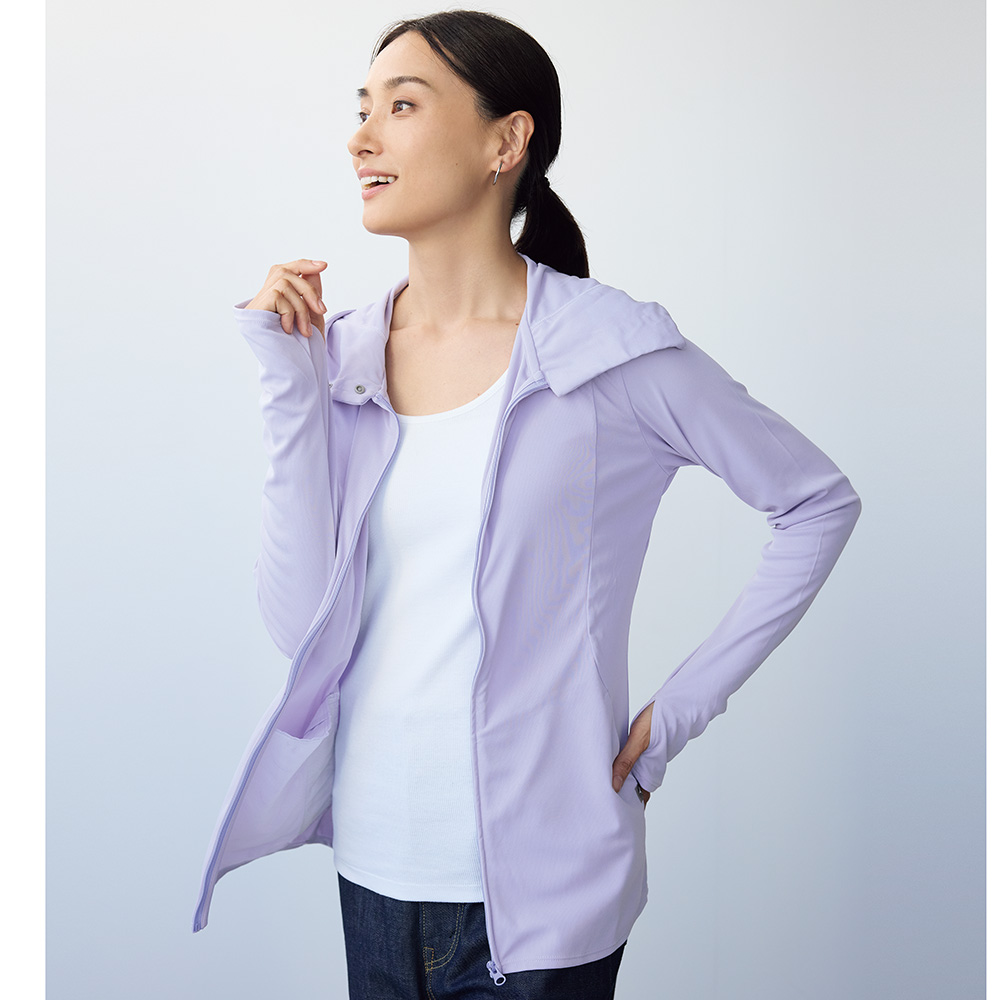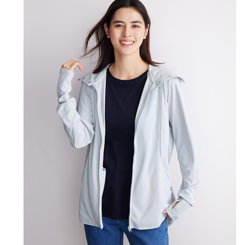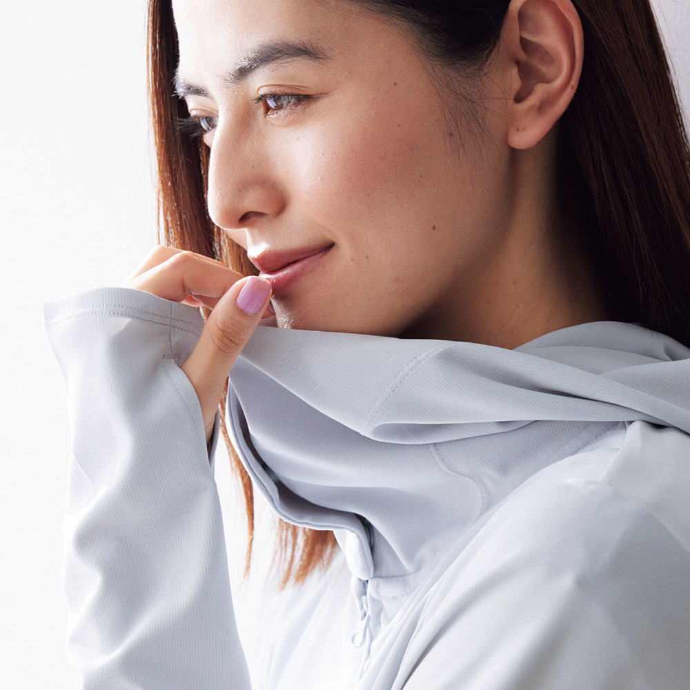 袖口はサムホール付きで、手の甲までしっかり紫外線を抑えます。首元はスナップボタンを開閉してアレンジ。
