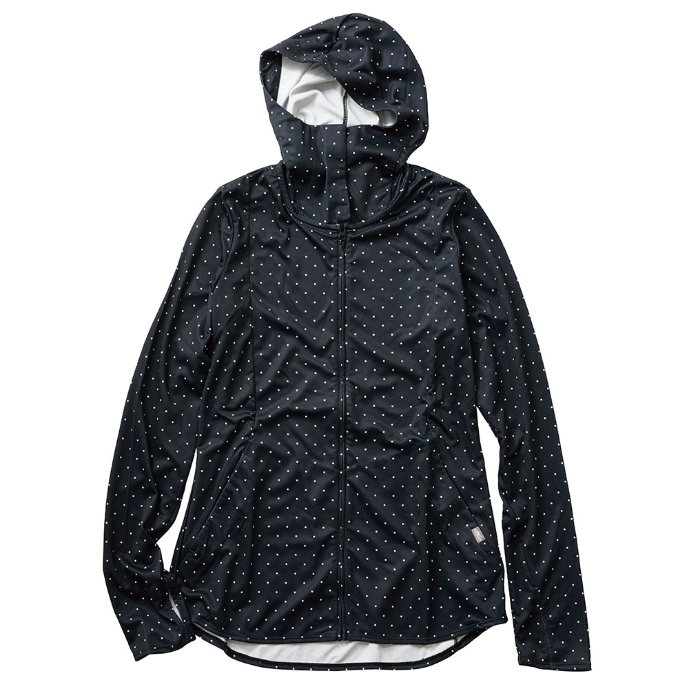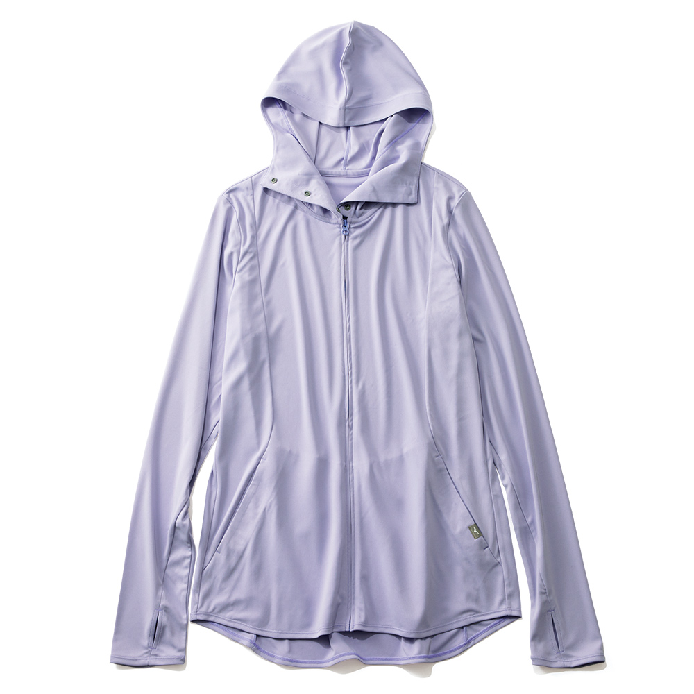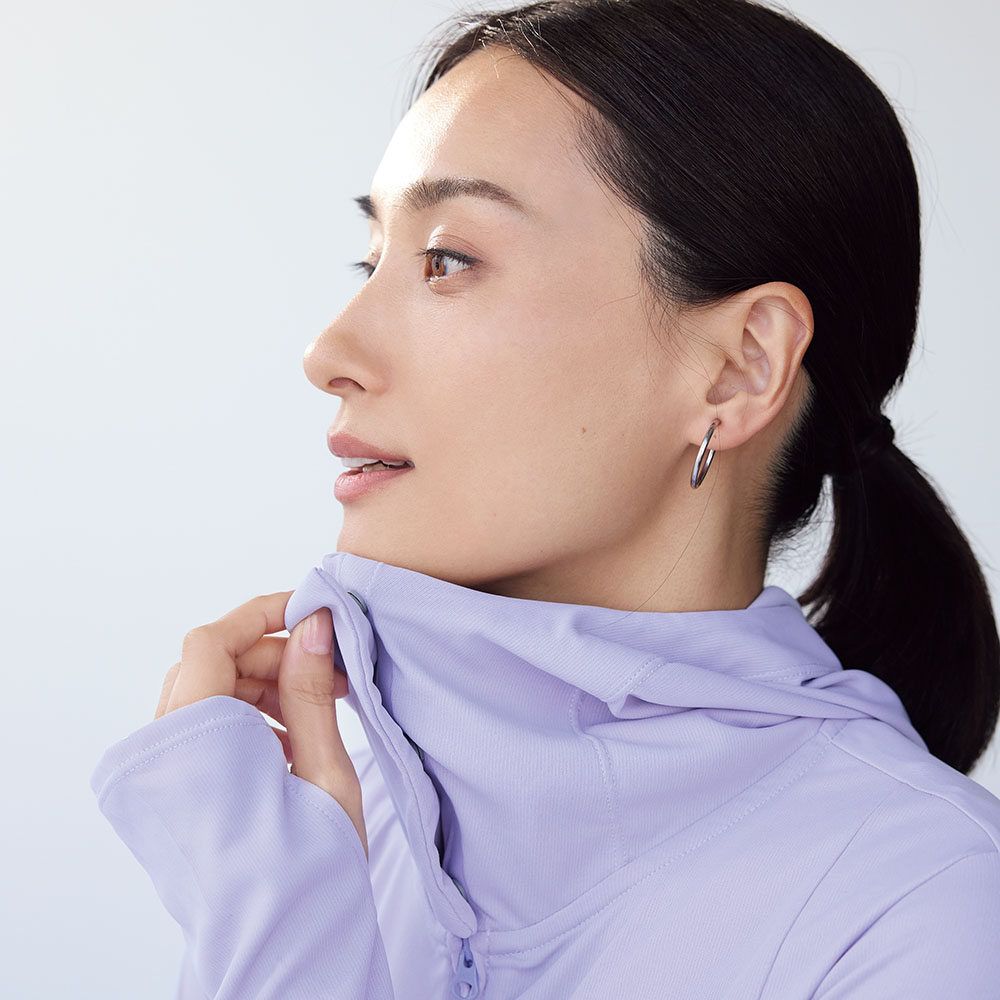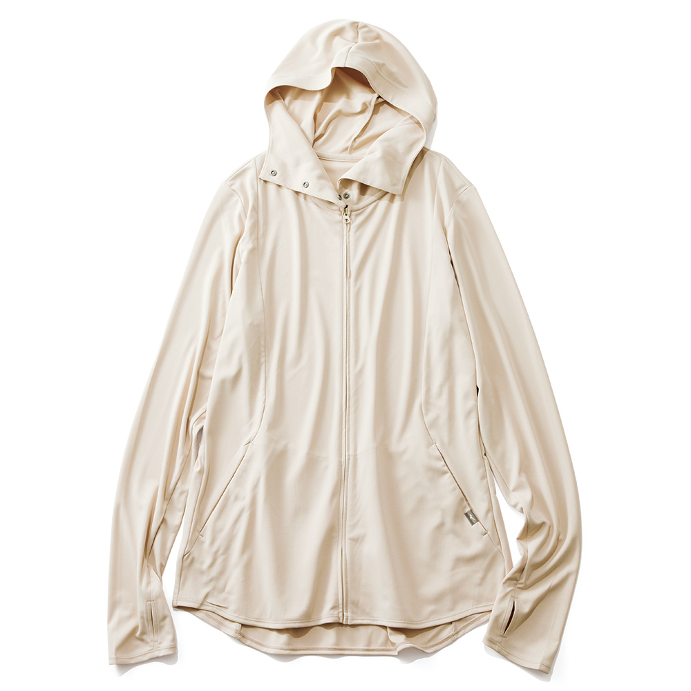 袖口はサムホール付きで、手の甲までしっかり紫外線を抑えます。首元はスナップボタンを開閉してアレンジ。