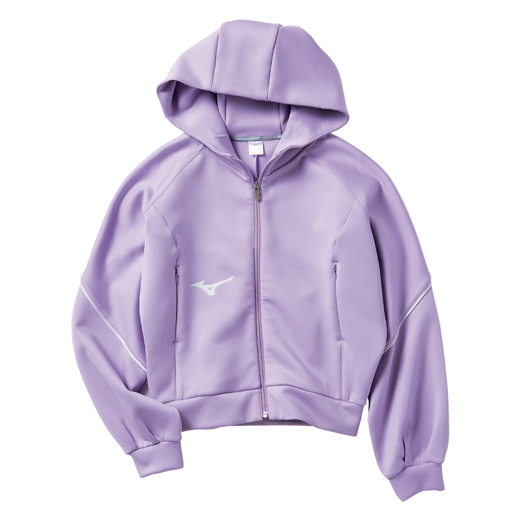 デイリーにも、軽いトレーニングウェアとしても快適に着られると人気のMIZUNOのスウェットアイテム。形をリニューアルしたフーディは少し短めの丈とゆったりしたドルマンスリーブで、丸みのある女性らしいシルエットに。素材は肌触りのいいピーチ起毛で着心地も申し分なしです。商品画像の説明。