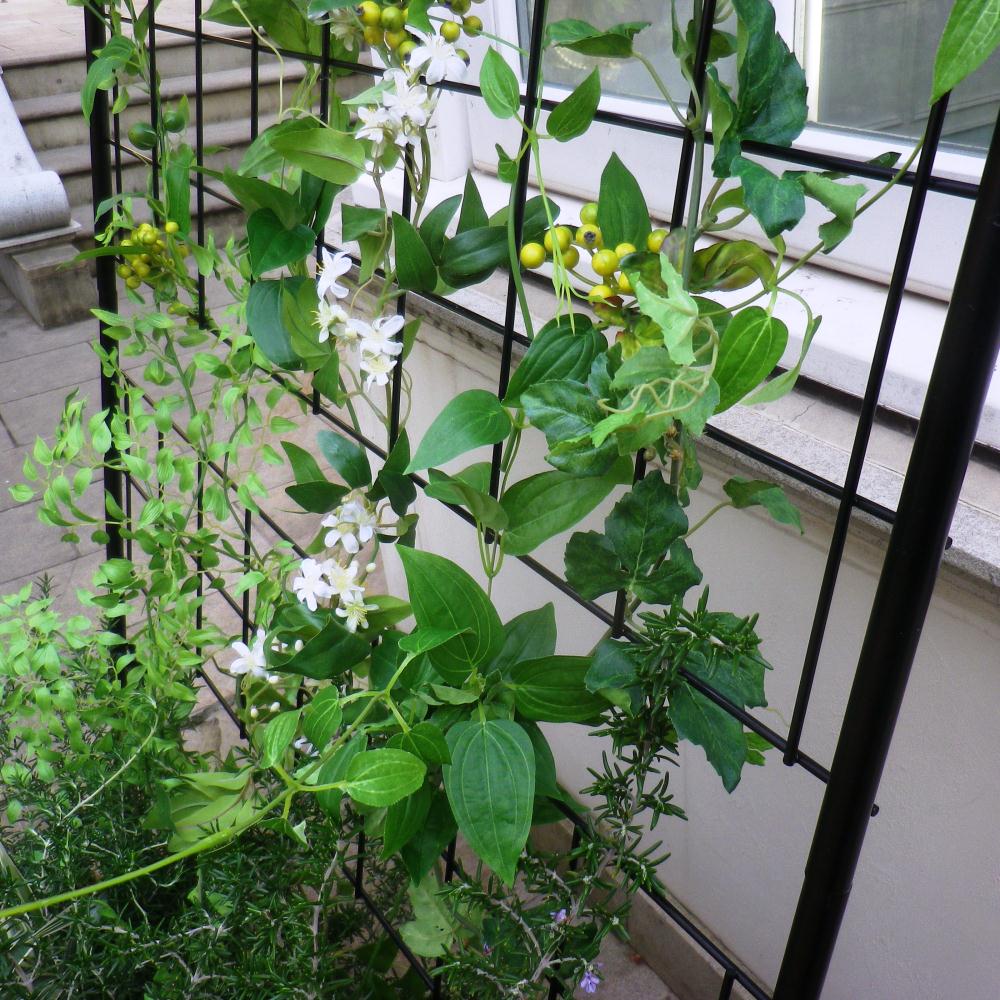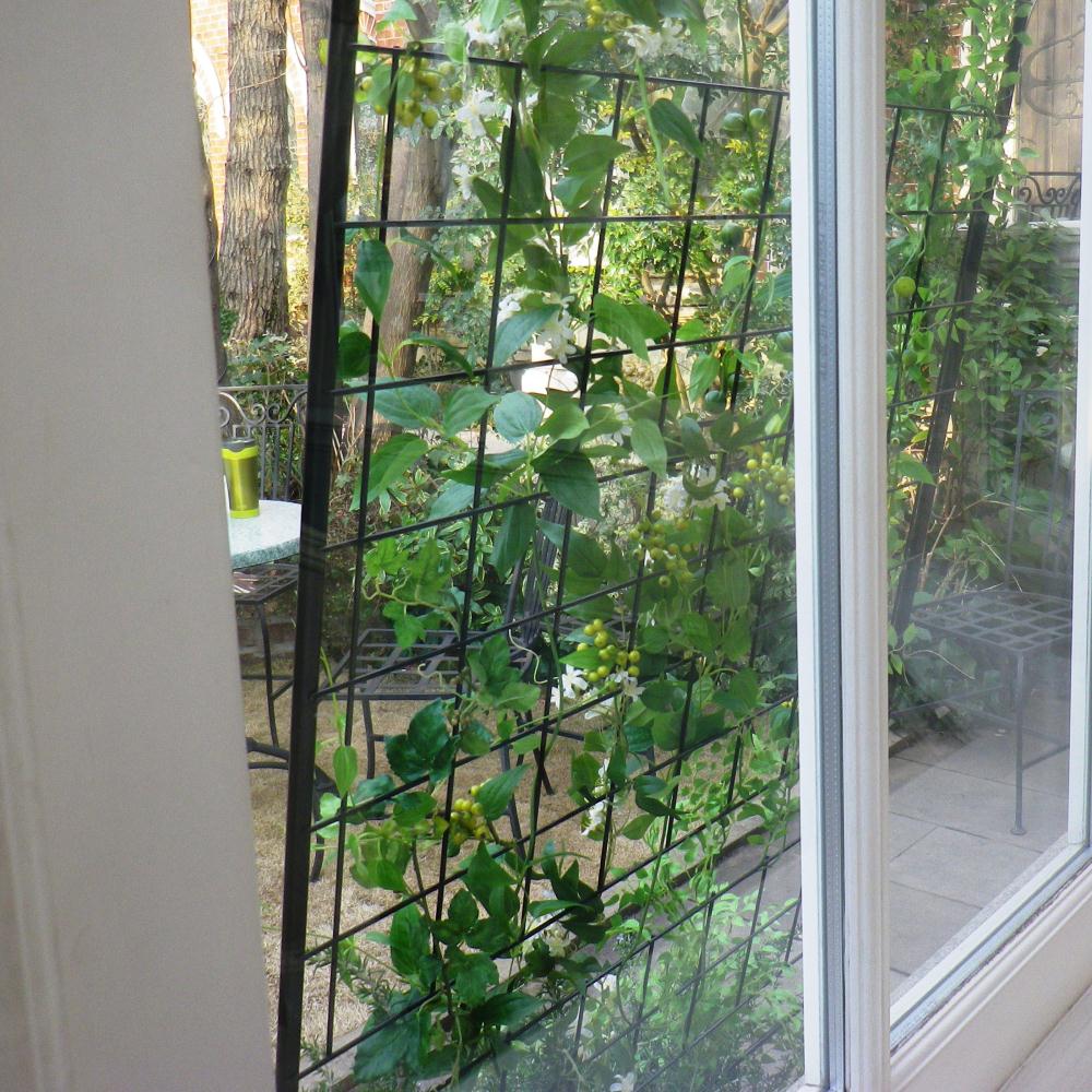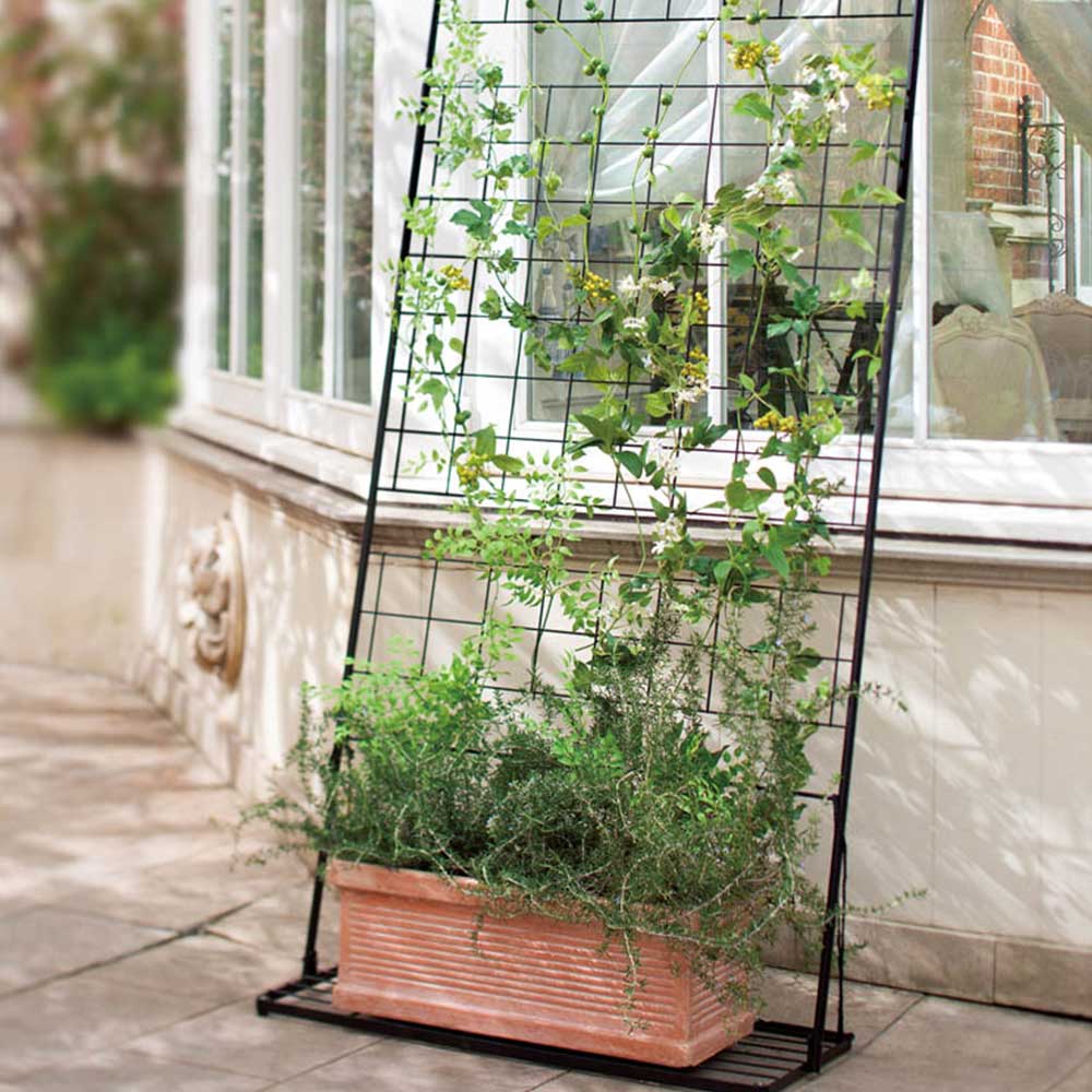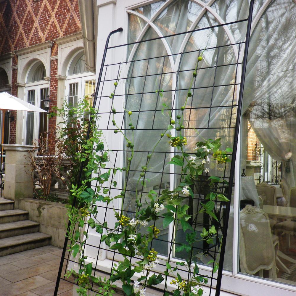 細めのアイアンのトレリス(ラティス)で植物を絡みやすくしています。