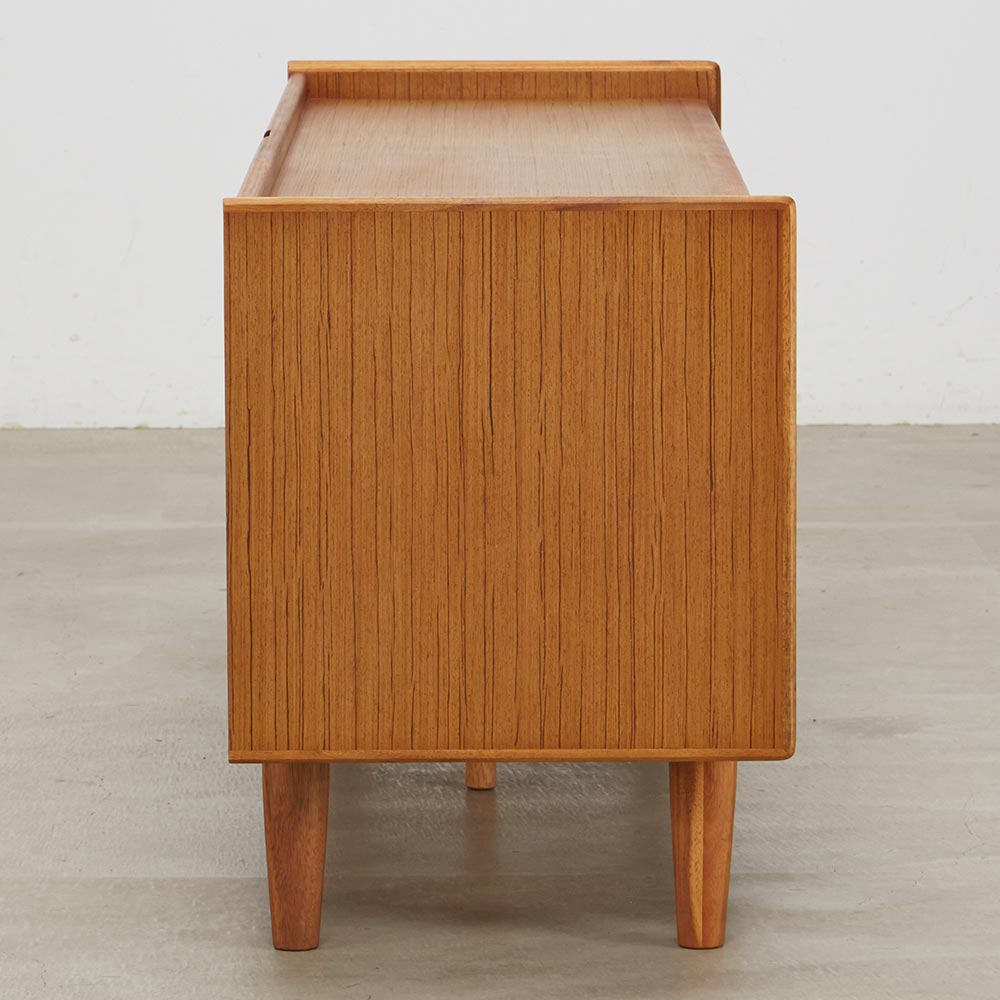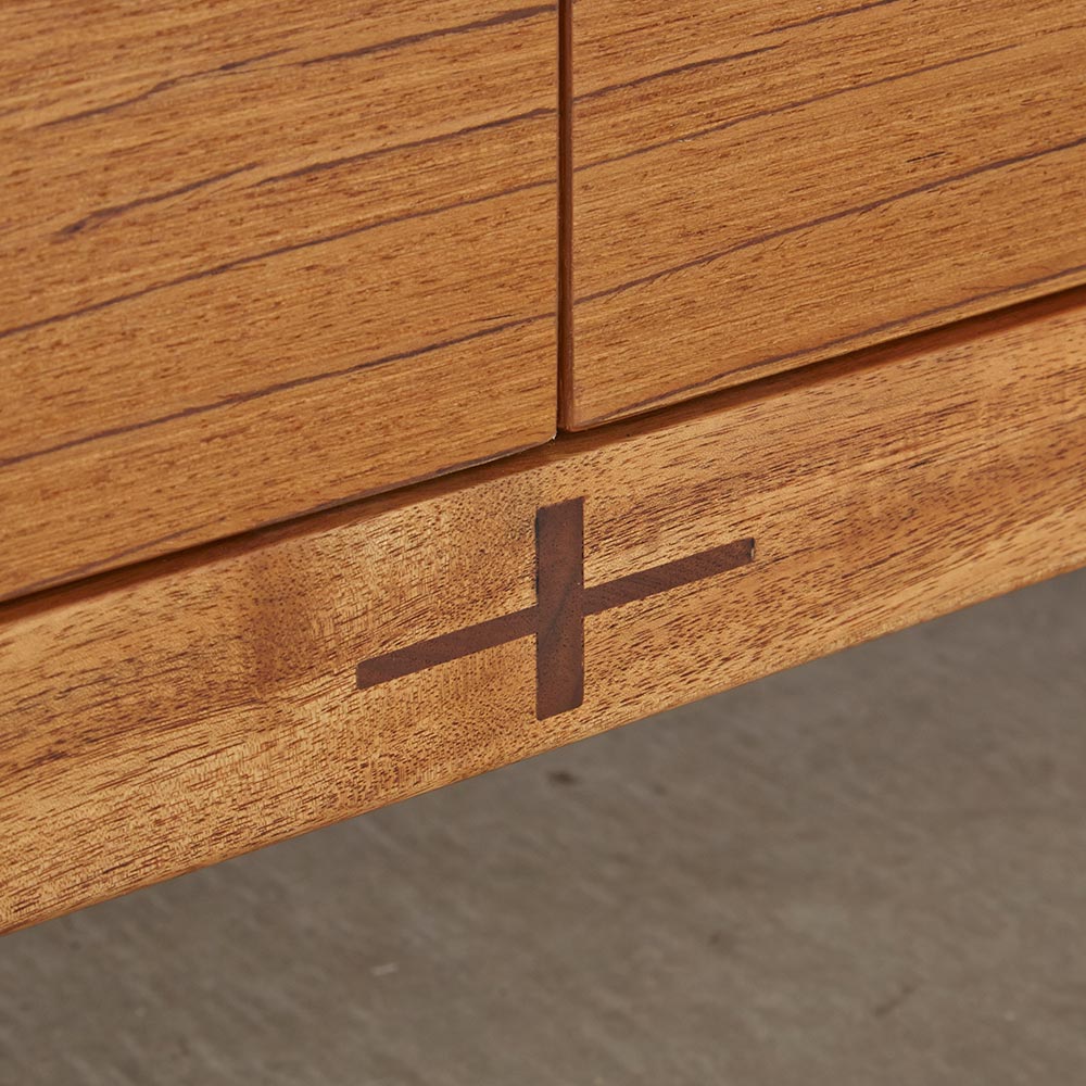 チークの木目が美しい突き板仕様、柔らかい曲線でやさしく手になじむ取っ手、先端に向かって細くテーパードした脚など、手間暇を惜しまず熟練の技で仕上げた造りも特徴です。