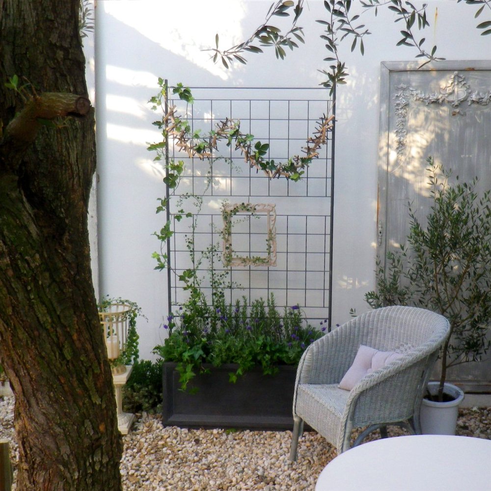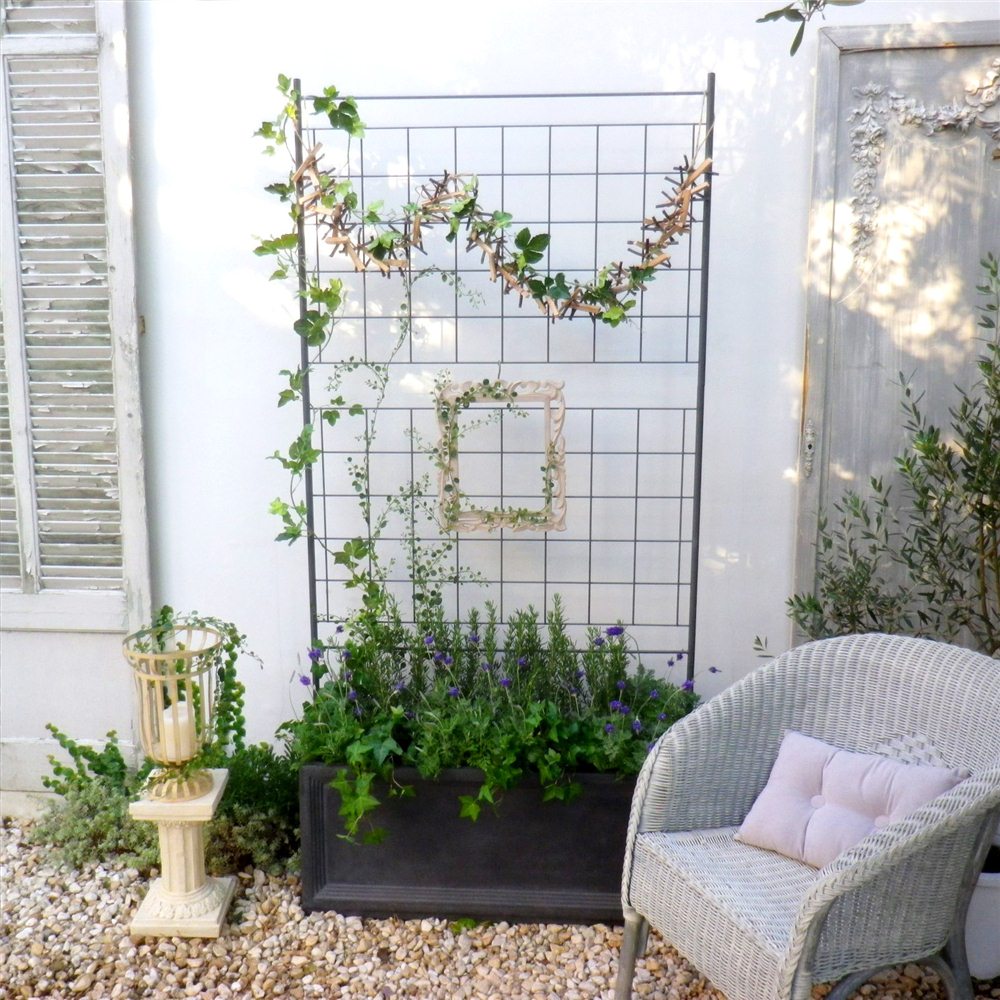 ・植物が絡みやすい格子柄は、背景を引き締める効果も。