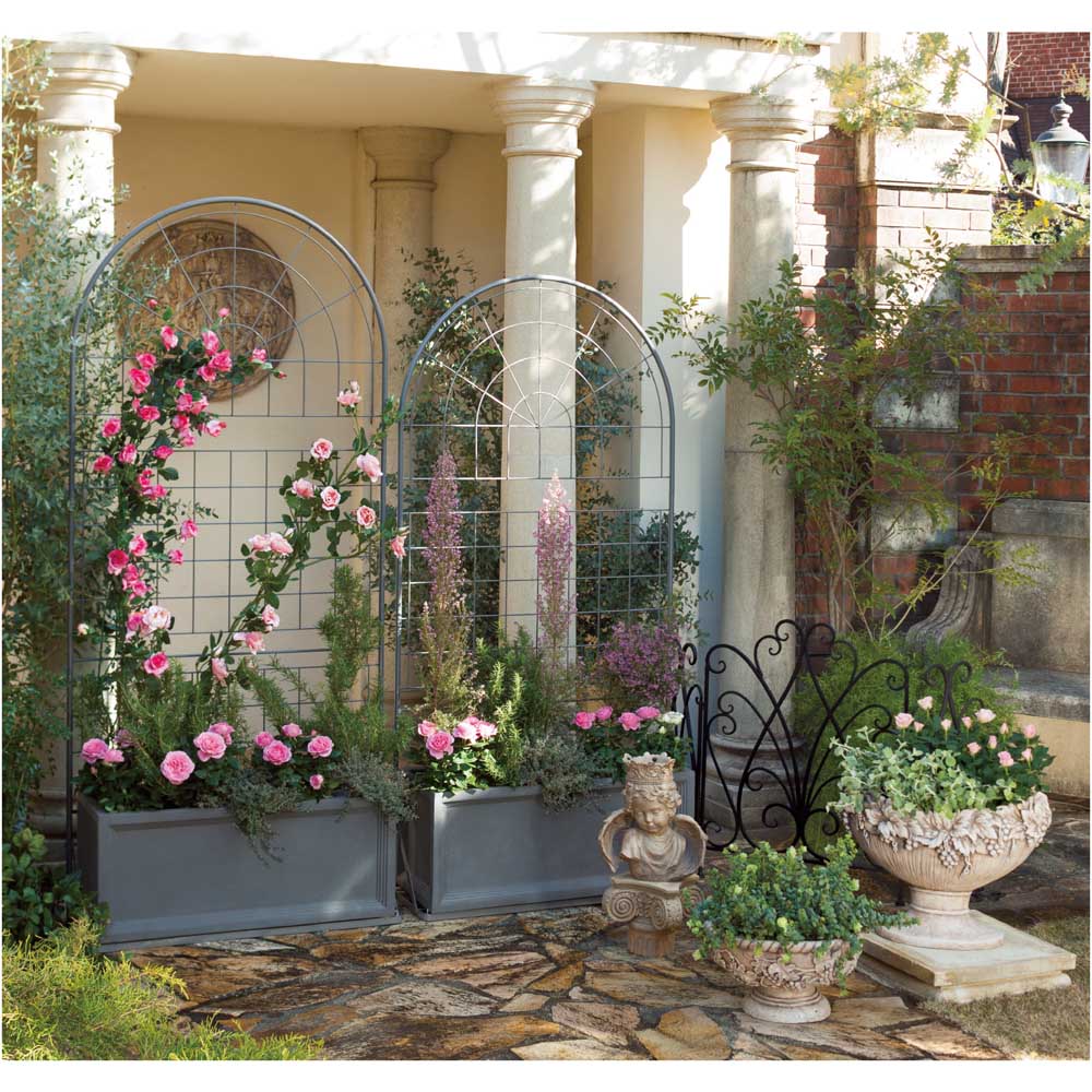 ・落ち着いたカラーはイングリッシュ風ガーデンにもしっくりなじみます。・植物が絡みやすい格子柄は、背景を引き締める効果も。