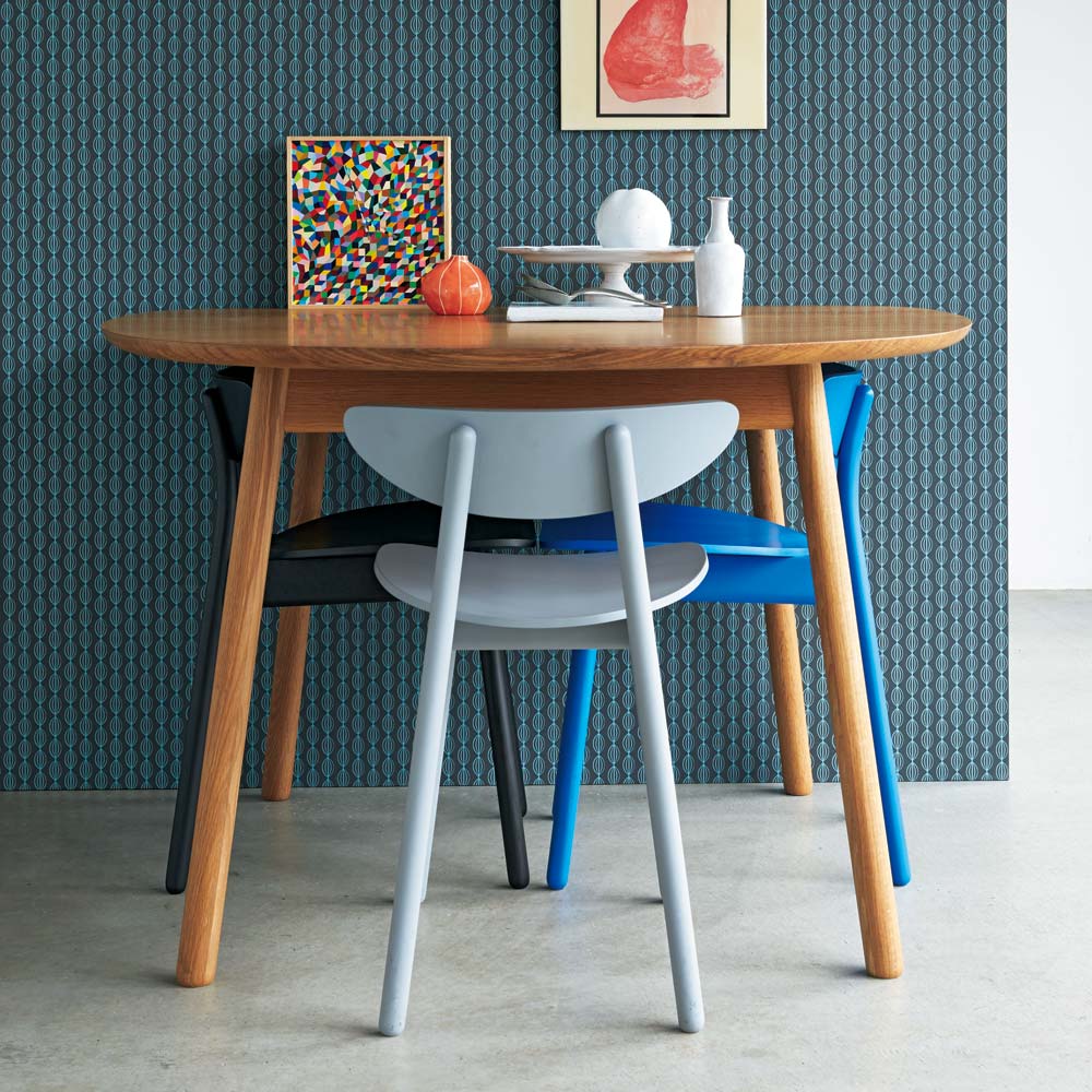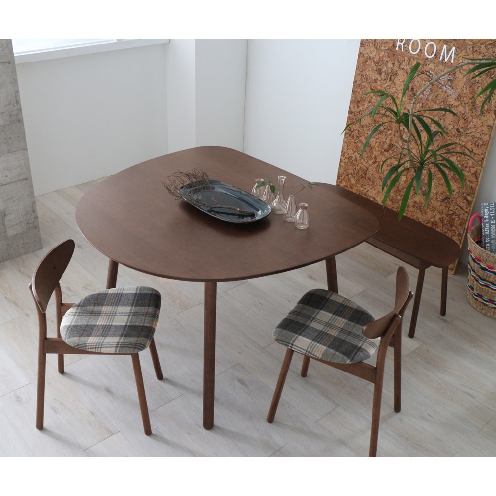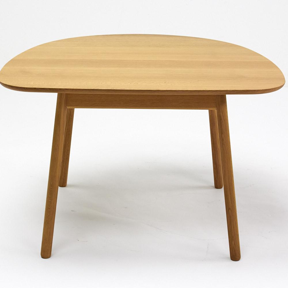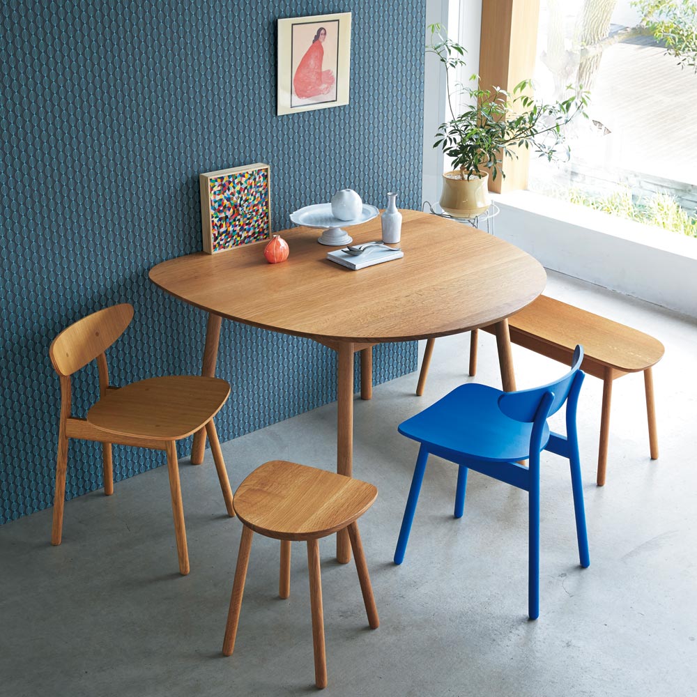 幅111cmのコンパクトサイズで、チェアの座面をそのまま大きくしたような半円に近いデザインがユニークなリビングダイニングテーブルです。やさしい印象の曲線フォルムは、1辺が直線に近くなっているので、壁に寄せて省スペースで置くことができ、お部屋を広々使えます。