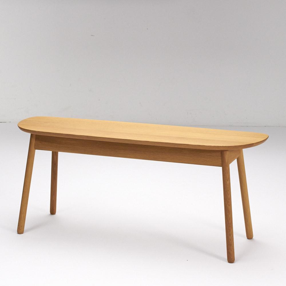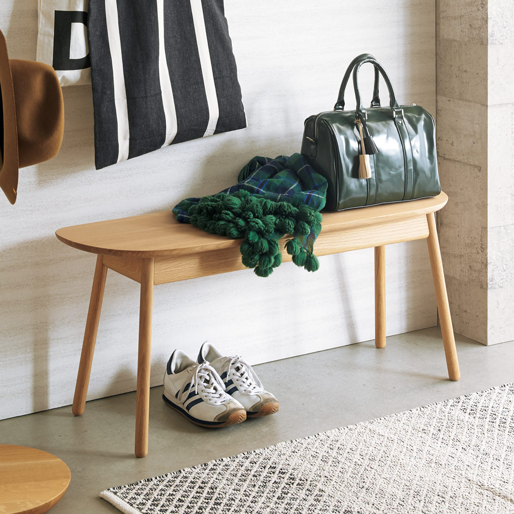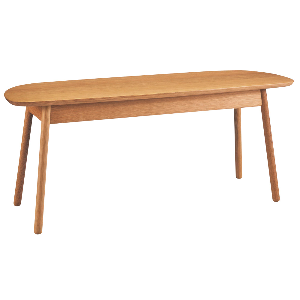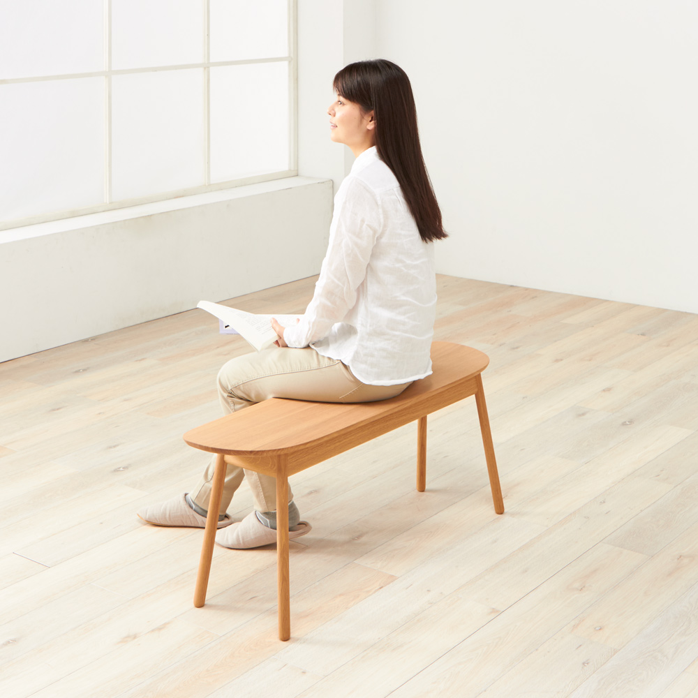 やさしい印象の曲線フォルムに、細身の脚が軽快な印象。無垢材の温もりある表情が際立つベンチです。