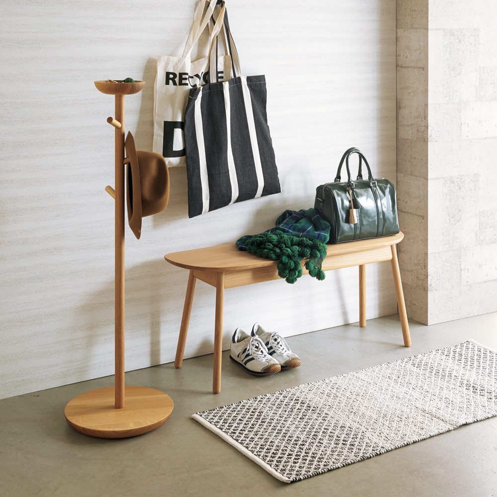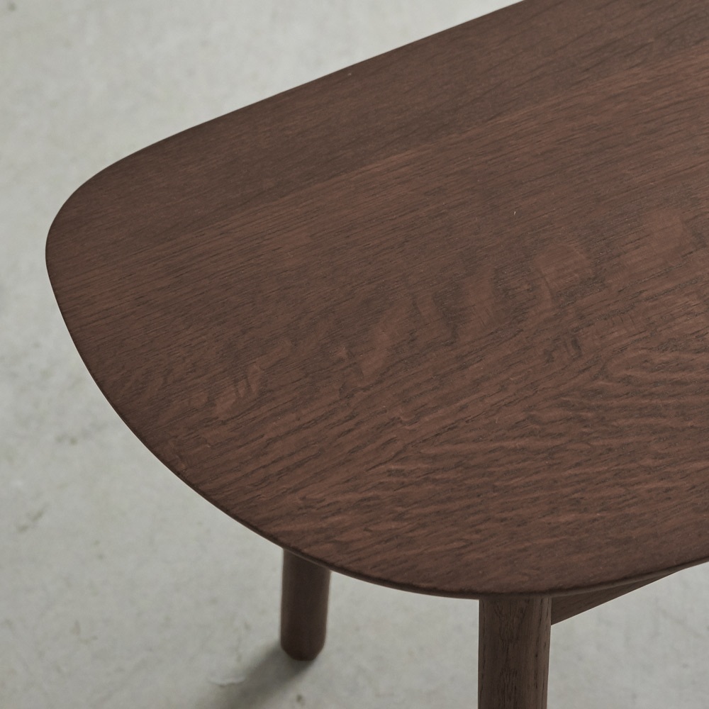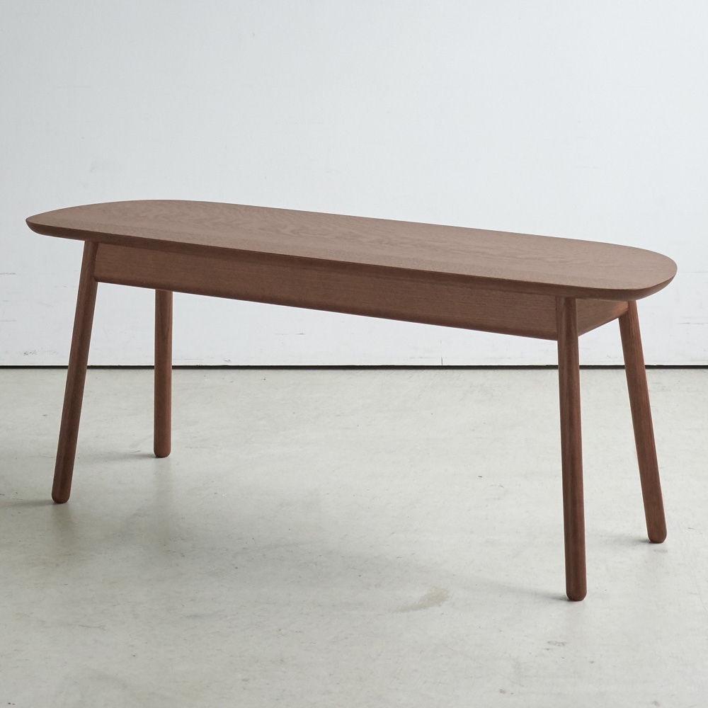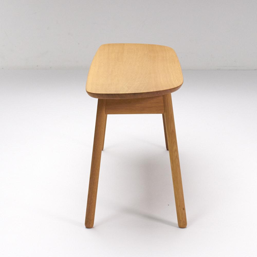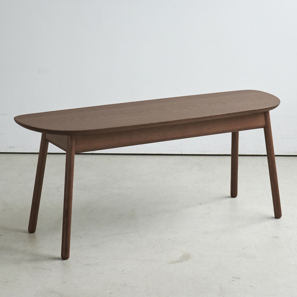 やさしい印象の曲線フォルムに、細身の脚が軽快な印象。無垢材の温もりある表情が際立つベンチです。