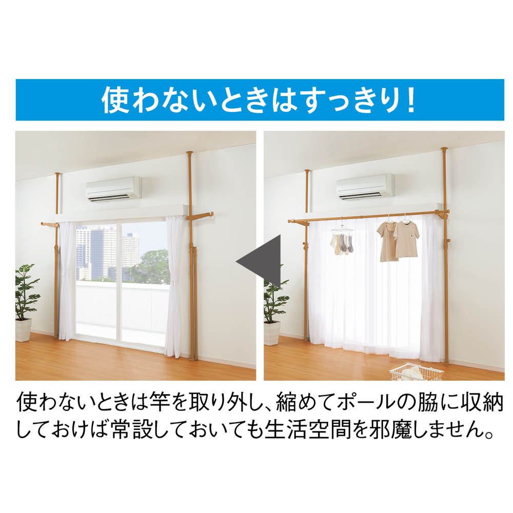 (イ)ナチュラル木目 使わないときは竿を取り外し、縮めてポールの脇に収納しておけば常設しておいても生活空間を邪魔しません。*竿2本タイプになります。