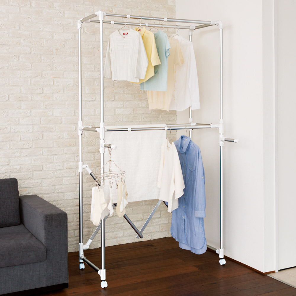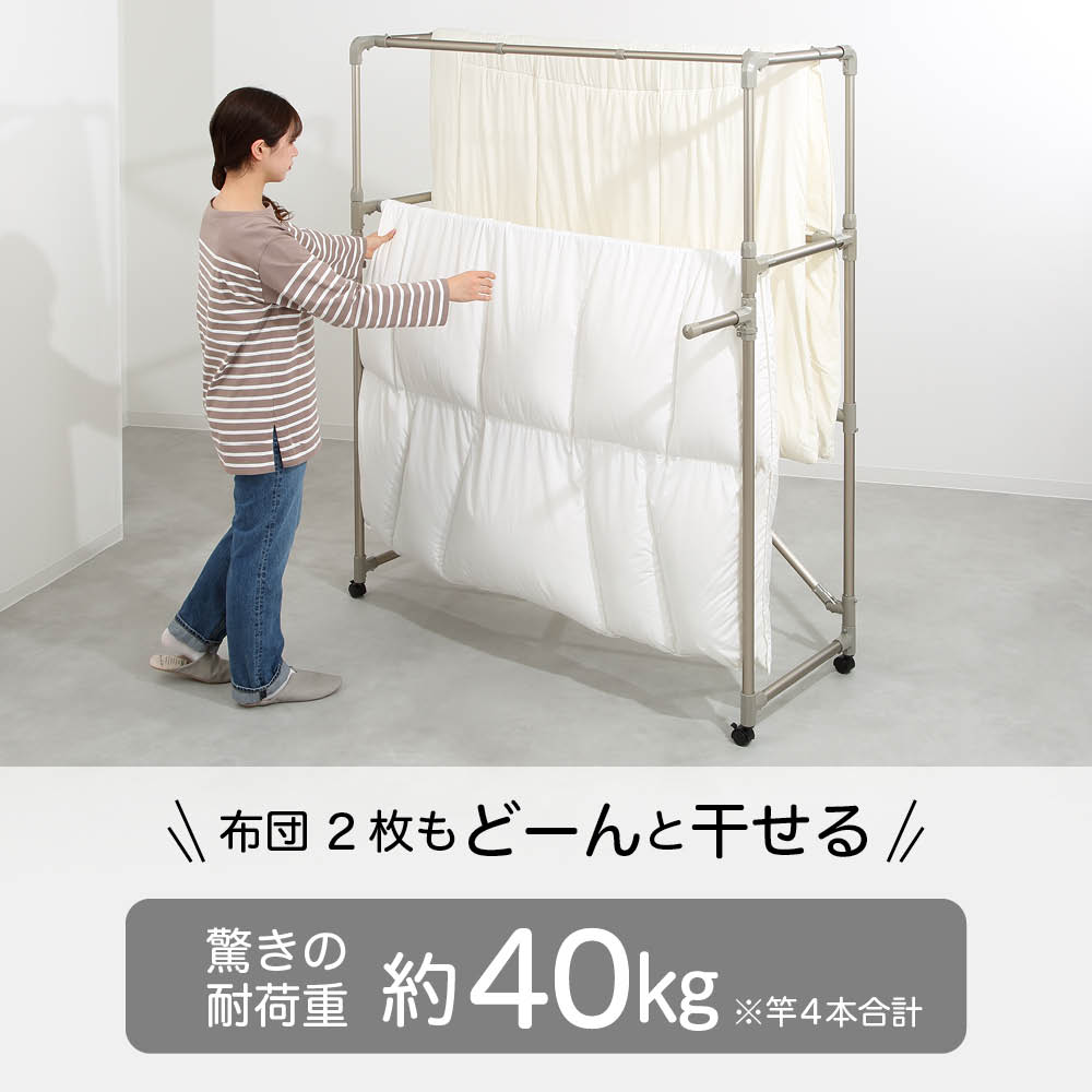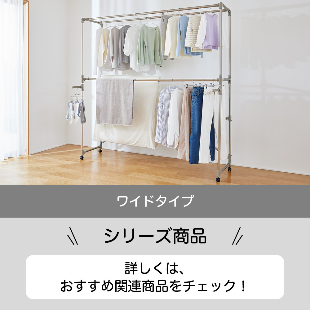 ●コンパクトなデザインながら、幅を伸ばせば布団やシーツなどの大物から、Tシャツ、小さな角型ハンガーまで、大量に干せる工夫がいっぱいです。