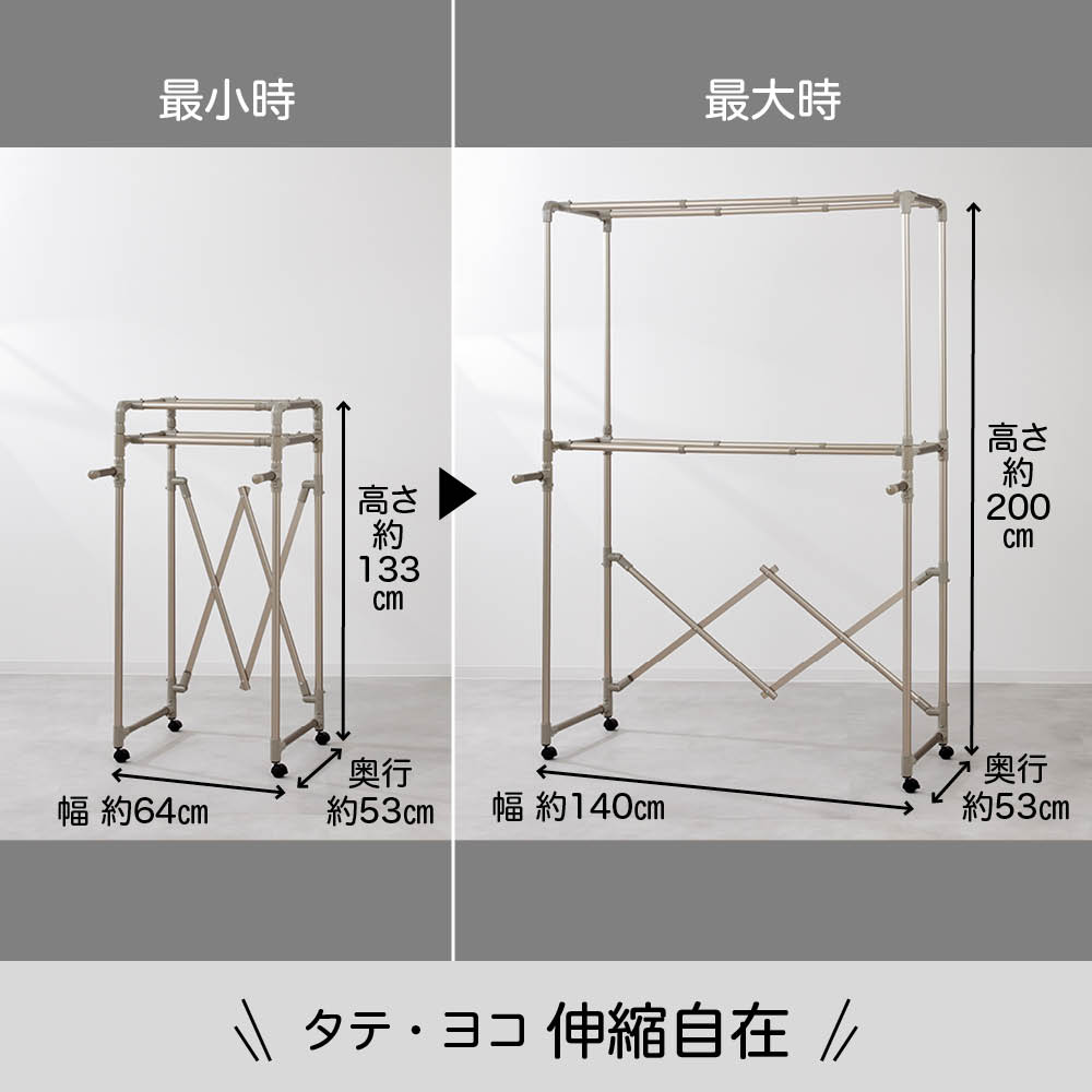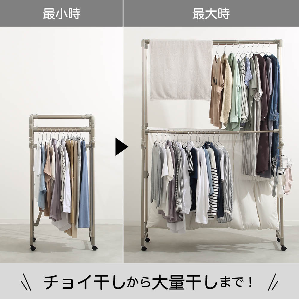●生活感のないスタイリッシュなデザインで、干す物に合わせて伸縮自在の人気シリーズに、脱衣所などにも気軽に置ける、最小幅64cmのレギュラーサイズが加わりました。