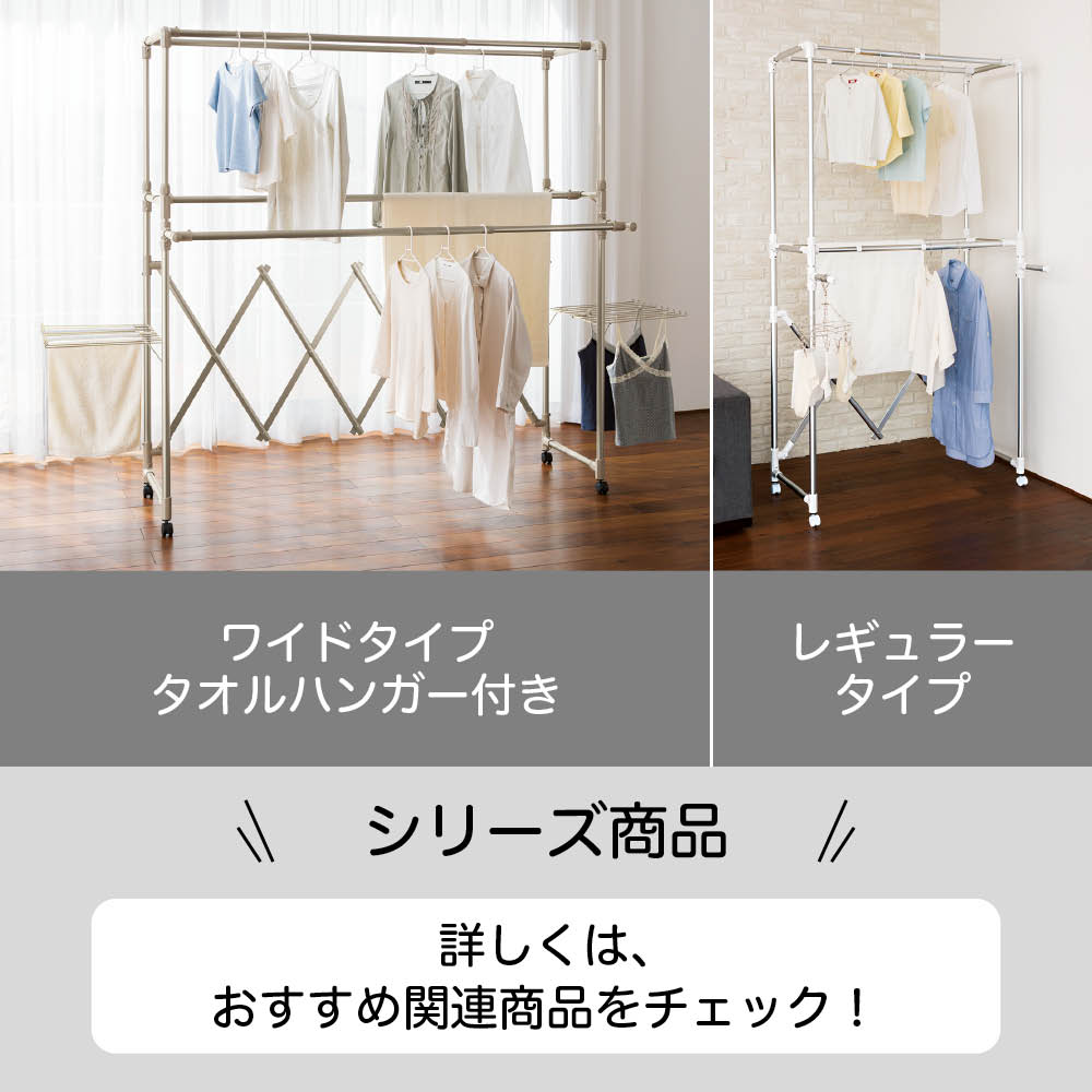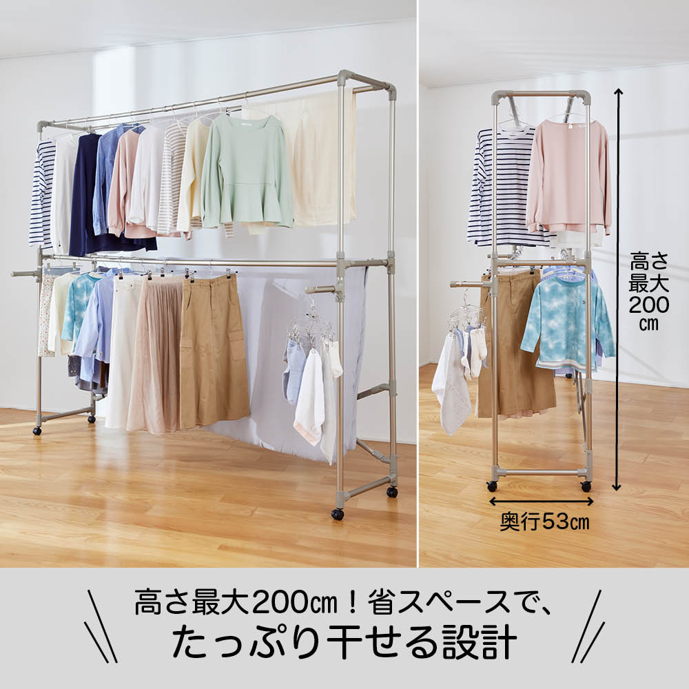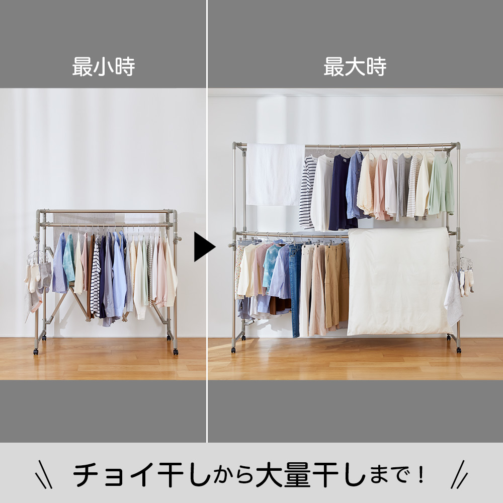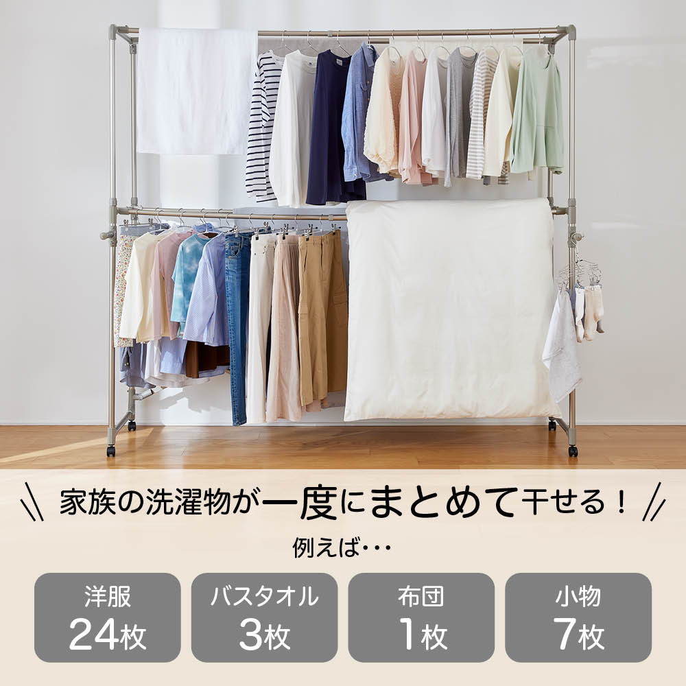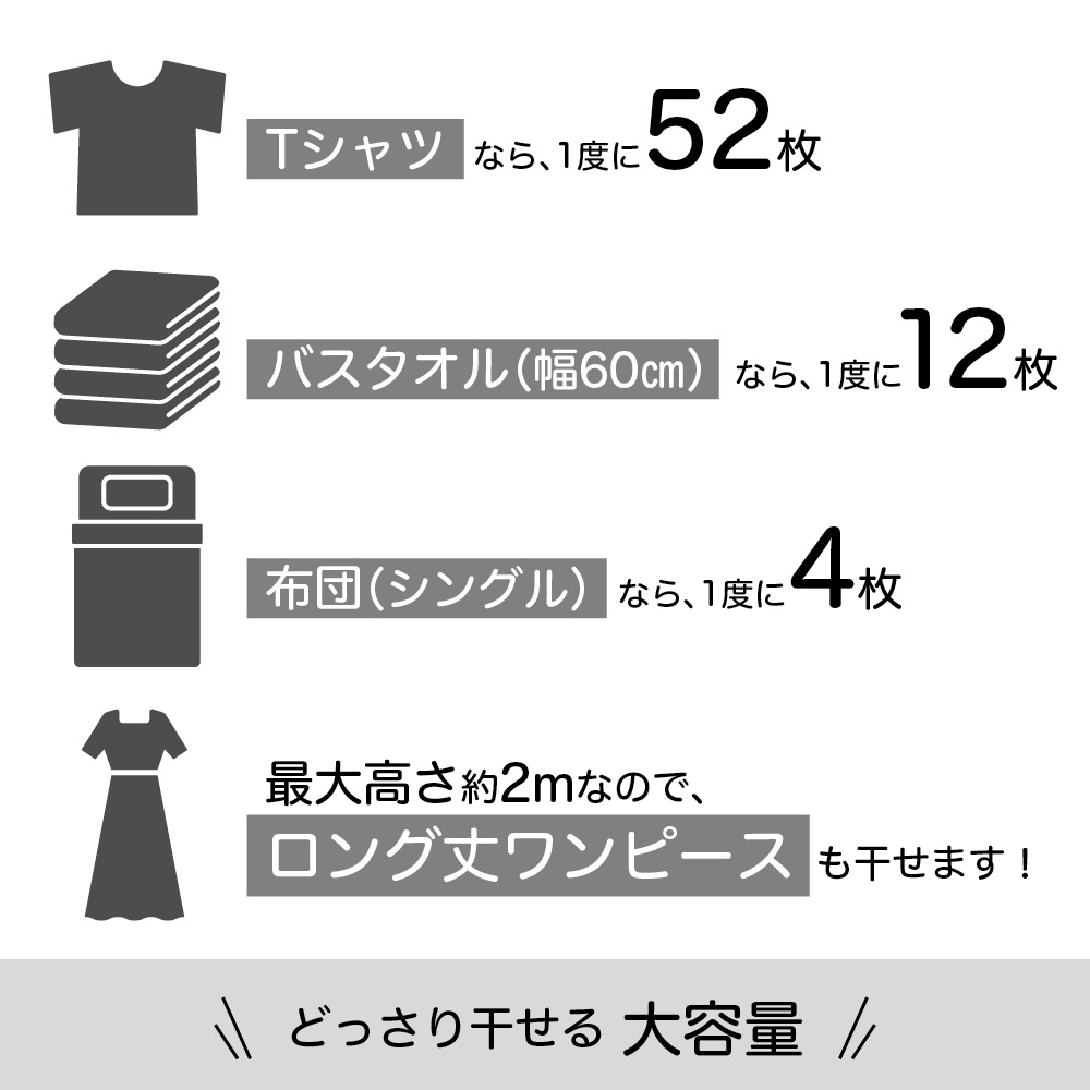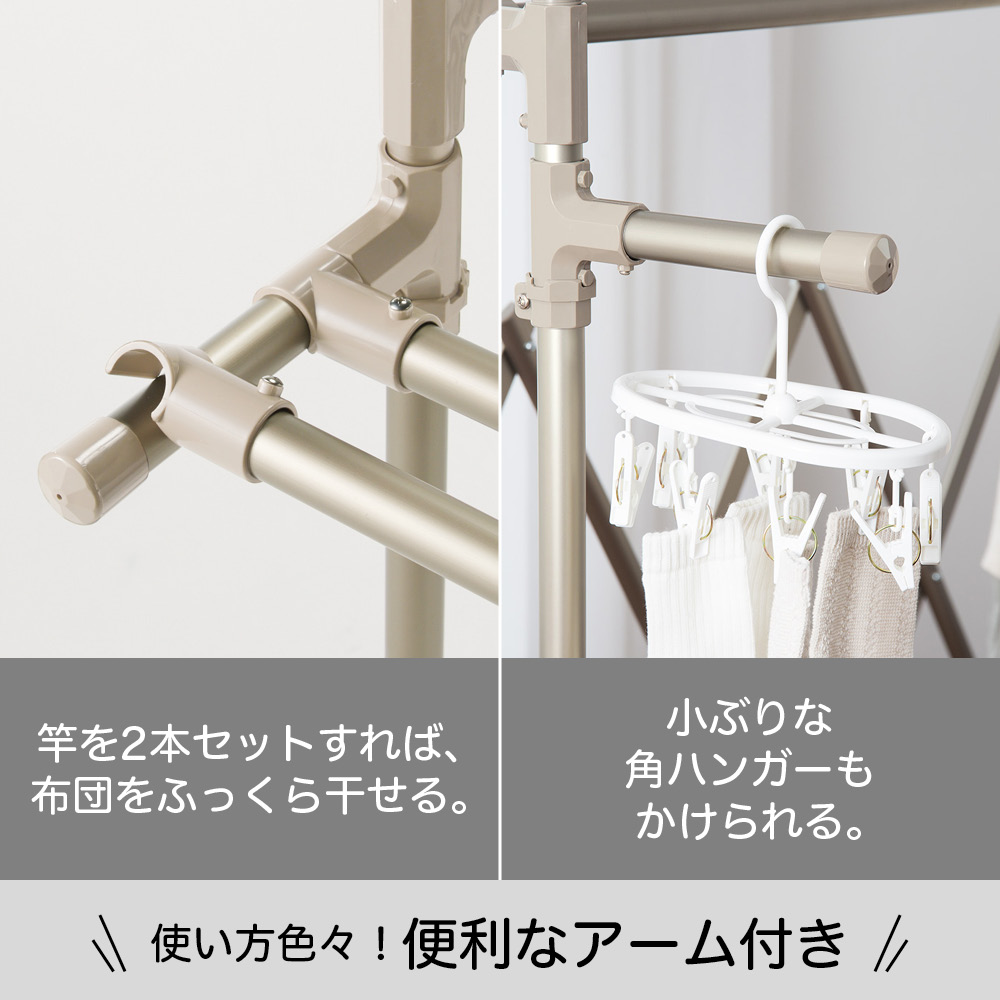 ●布団やシーツなどの大物からTシャツ、小さな角型ハンガーまで、大量に干せる工夫がいっぱいです。