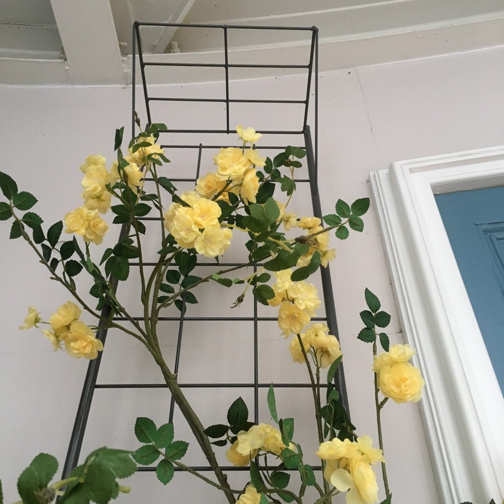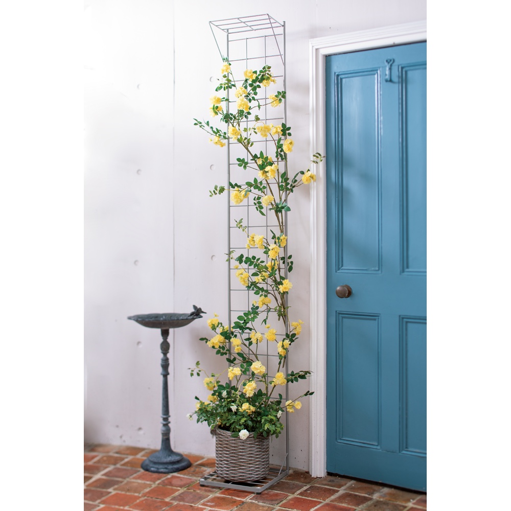 たっぷりはわせられる高さがあるので、壁面いっぱいのバラを楽しめます。スリムなので玄関そばのちょっとした空間にぴったり。プランターを使えば根が広がりすぎず手入れも簡単です。