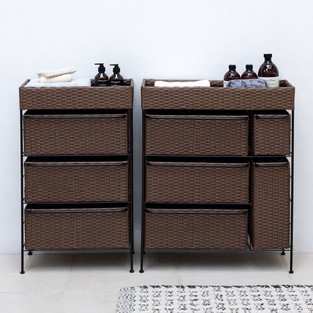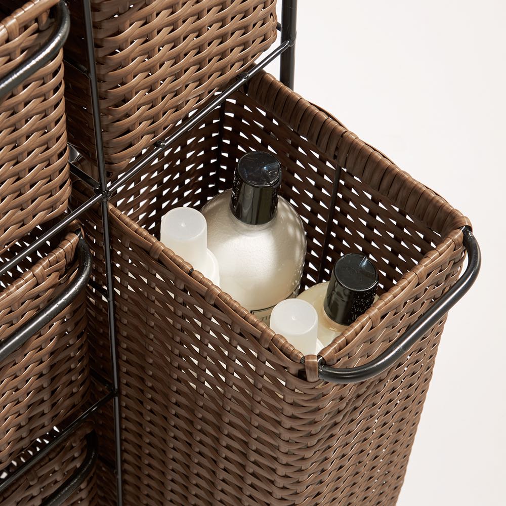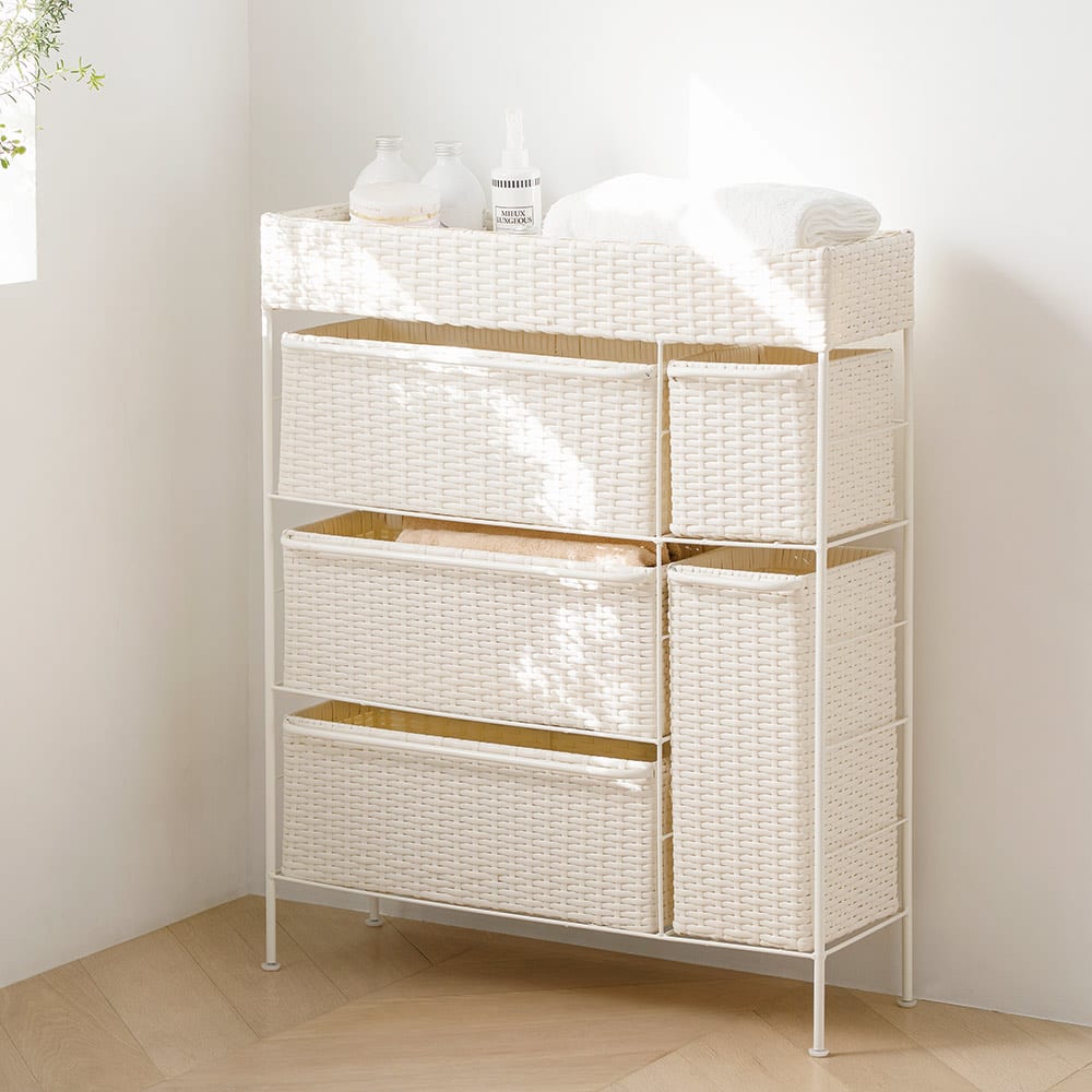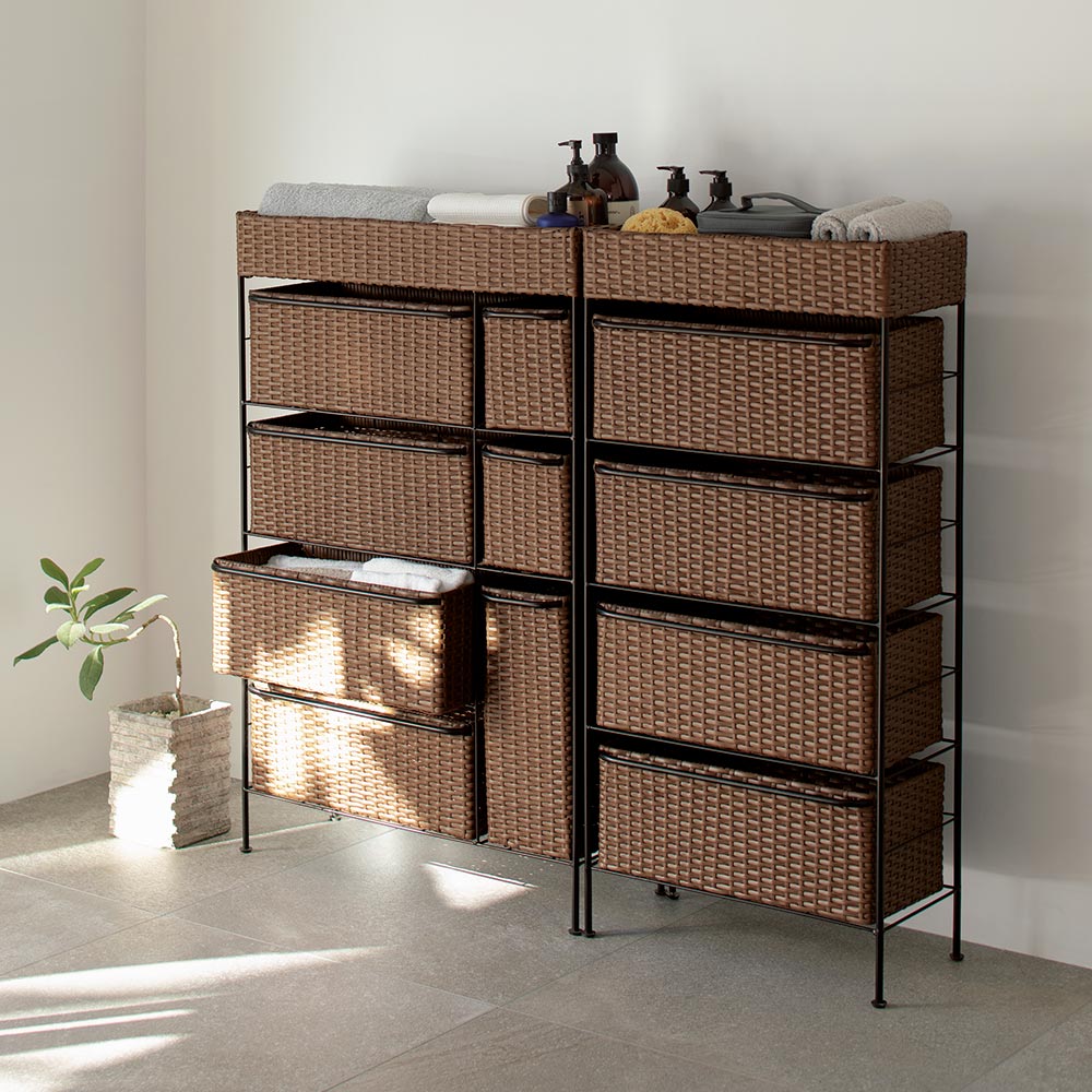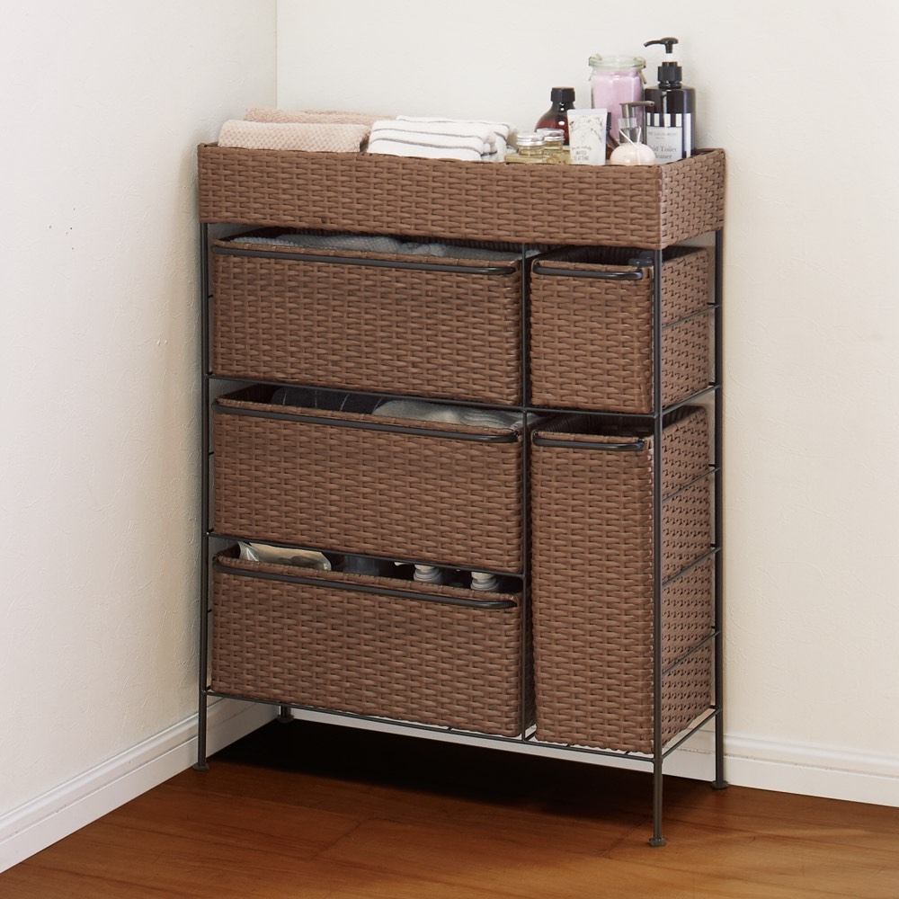 ラタン風のナチュラルな見た目で、バスルームからリビングまで、どんなインテリアにも違和感なく溶け込み、空間をおしゃれに演出。奥行きが浅いので狭い洗面所でも圧迫感なく置け、着替えやタオル、シャンプー類のストックなどを収納できます。よりお求めやすい価格になりました!