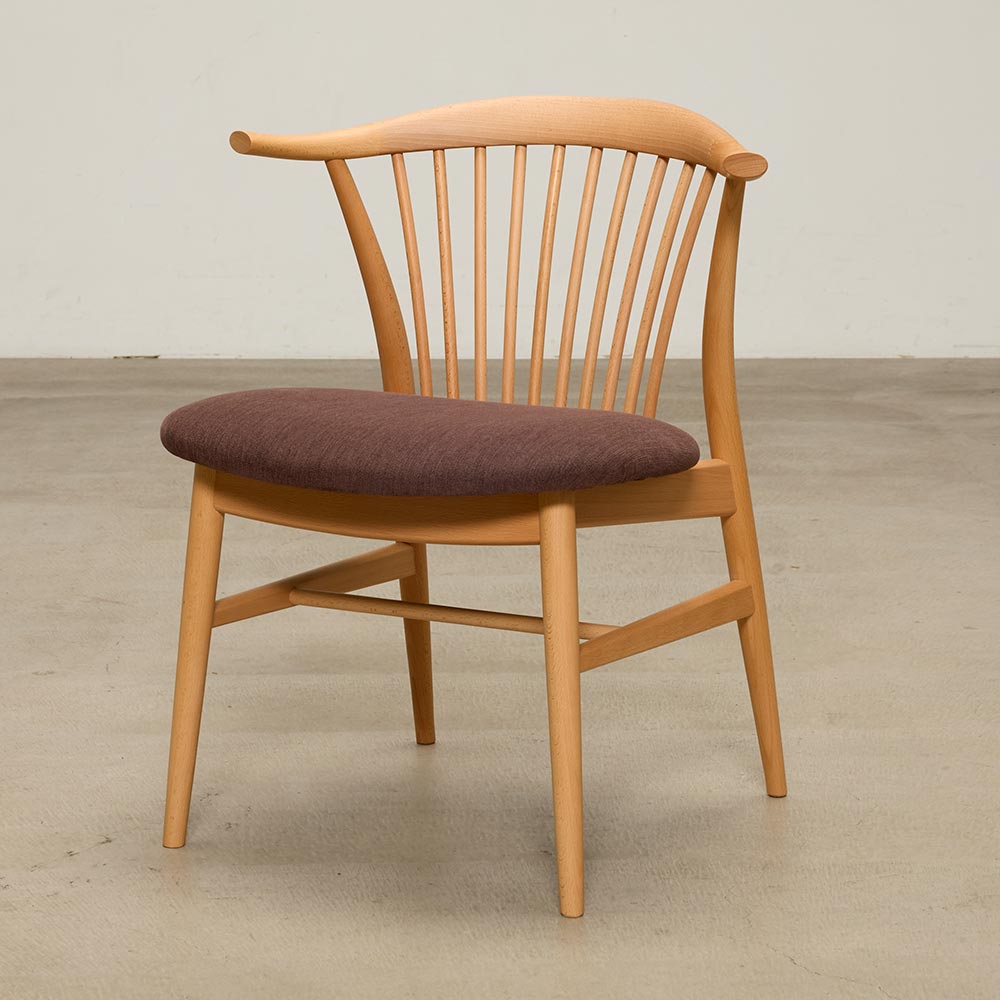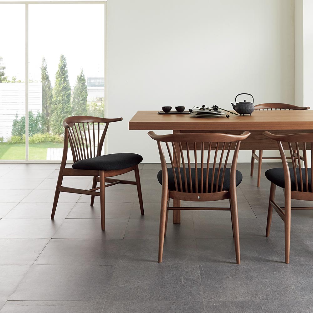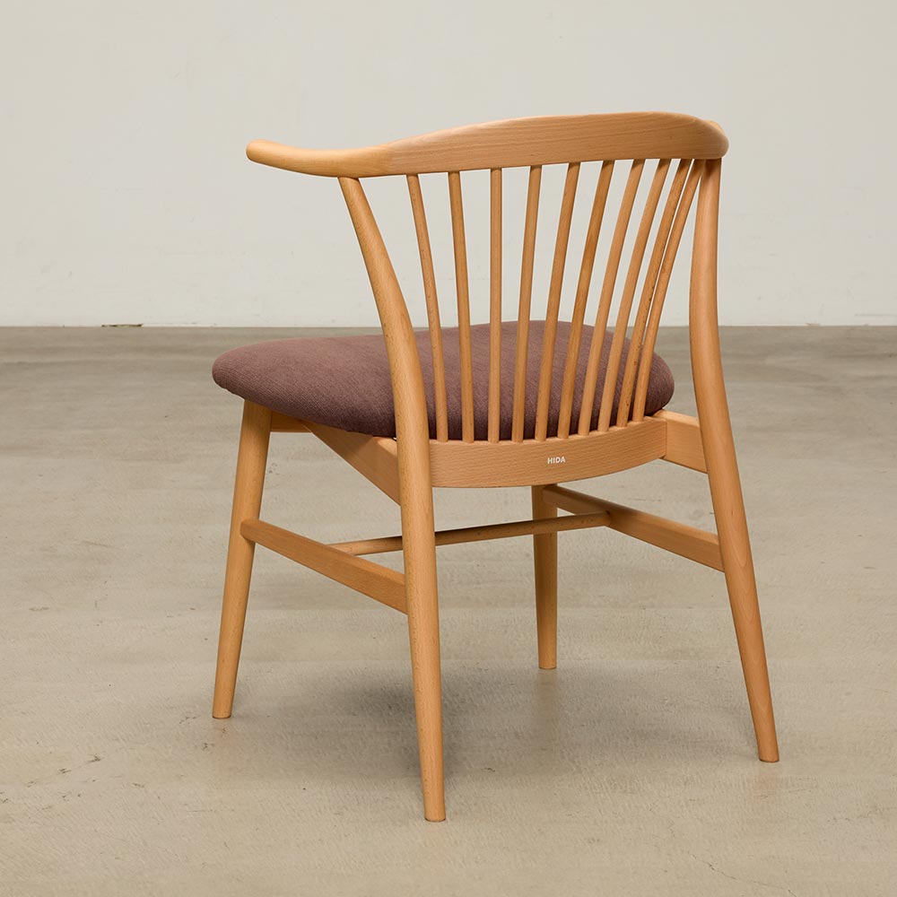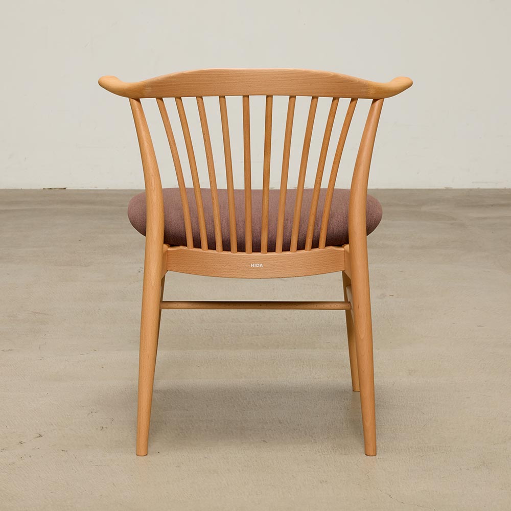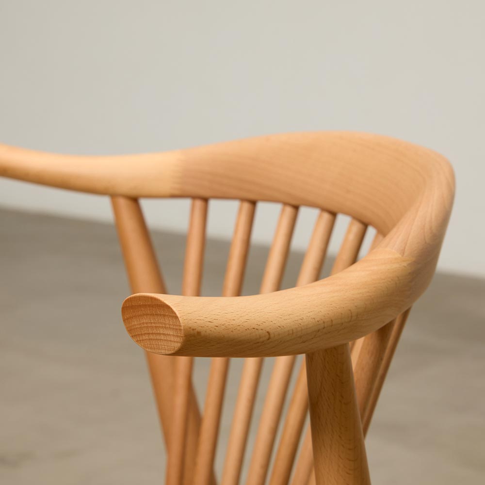脚部、少しずつ細くなるシルエット、スポーク(部上の背もたれ)まで繊細に計算された美しい形状が魅力。スポーク状のチェアは世の中に多々ありますが、細い木材で上品に仕上げつつ、しっかりとした強度を持たせることができるのはきちんと技術継承された職人だからこそ実現できる形です。