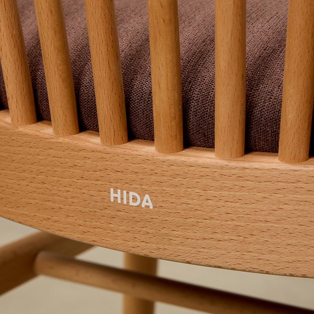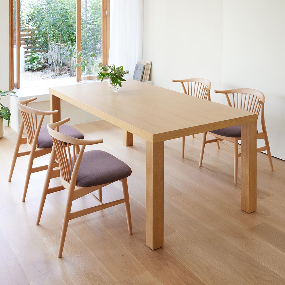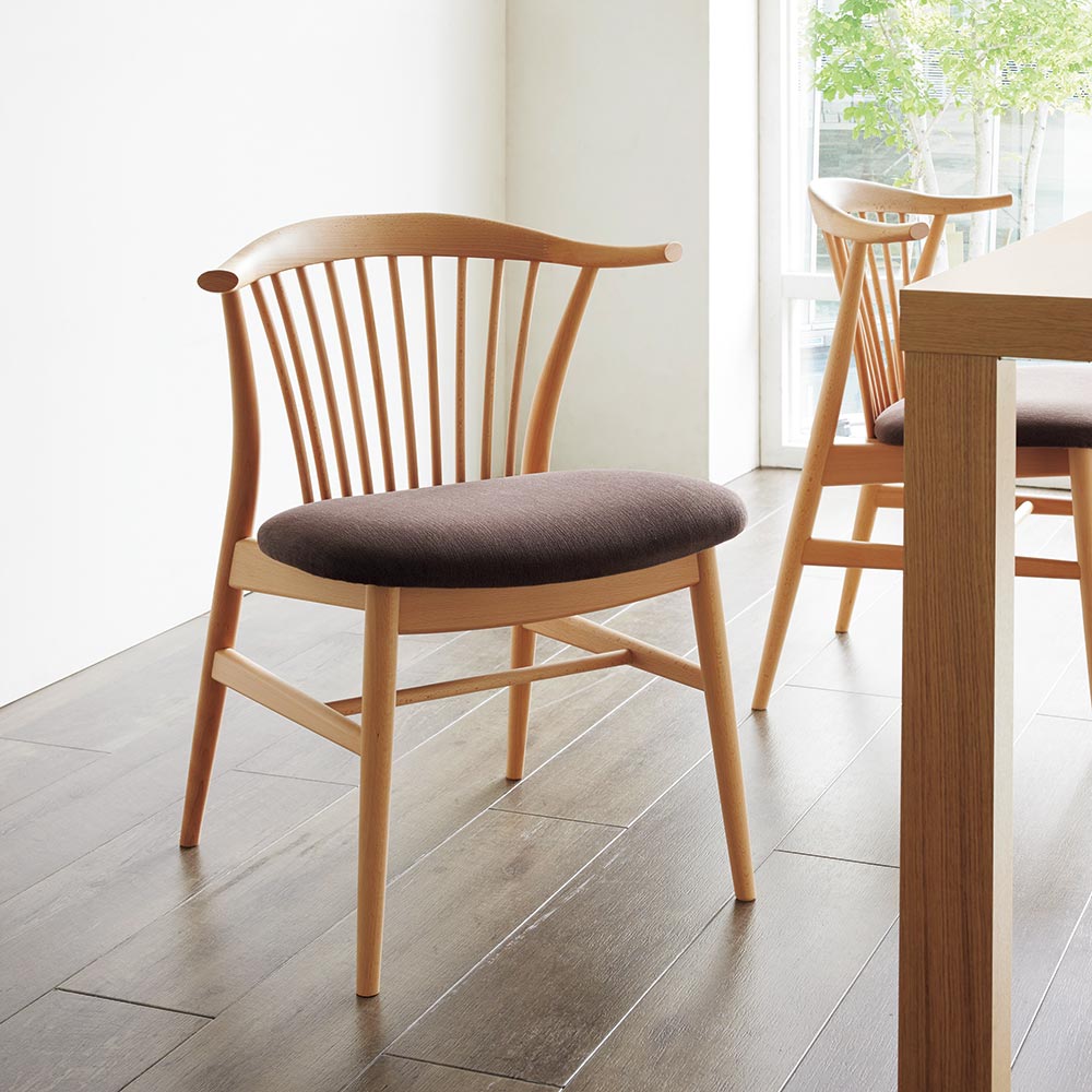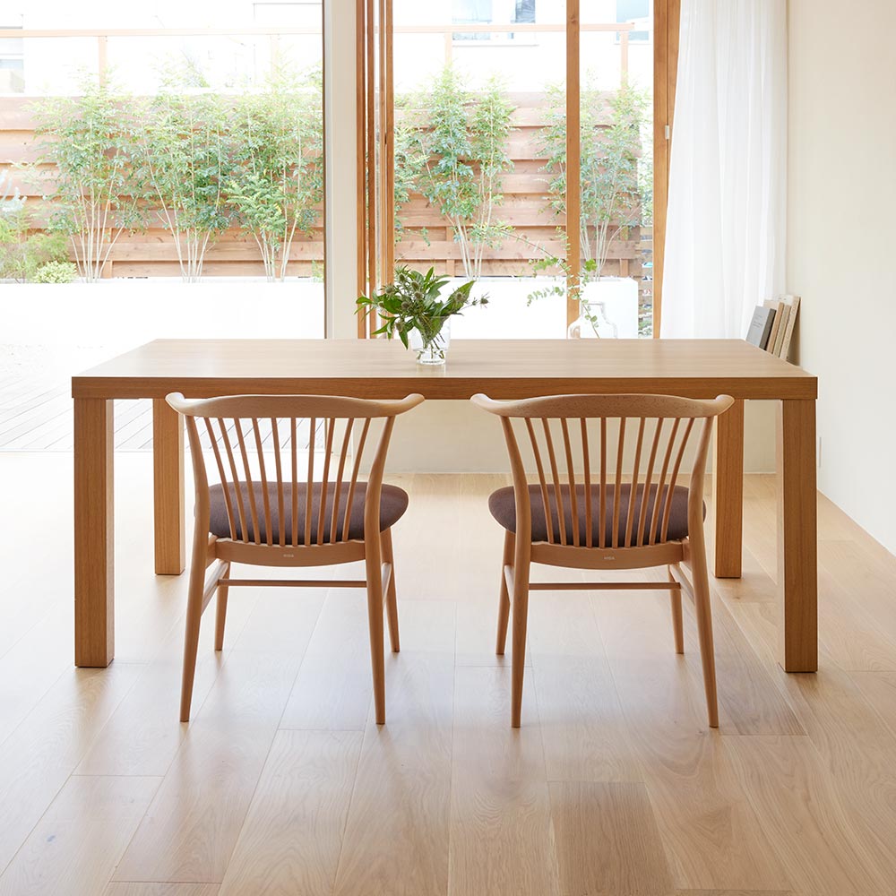 木目がはっきりと出て、表情豊かなナチュラル色と、ビーチ材をシックなウォルナット風のカラーに塗装したダークブラウン色を採用。座面の色もそれぞれのフレーム色に合わせて変えています。ハウススタイリングは、HIDA(飛騨産業)の正規販売店です