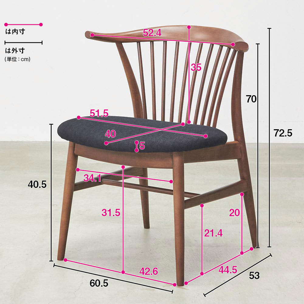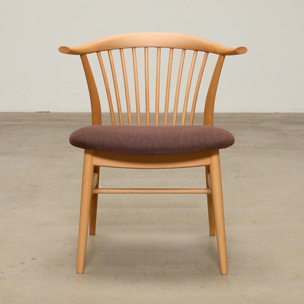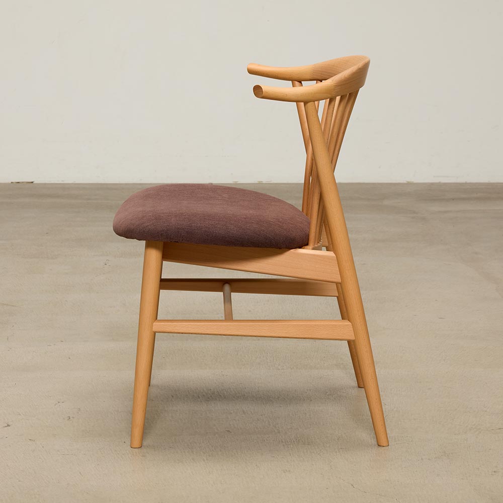 繊細なスポークと、邪魔にならないハーフアームがポイントのダイニングチェア。横幅が広くゆったりとした座り心地です。