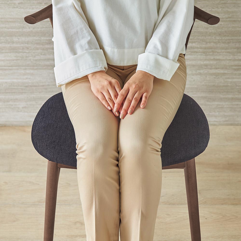 座面が広い分、肘部分をハーフアームとしてすっきりさせることでテーブルに無理なく椅子を収めることができるように設計しています。