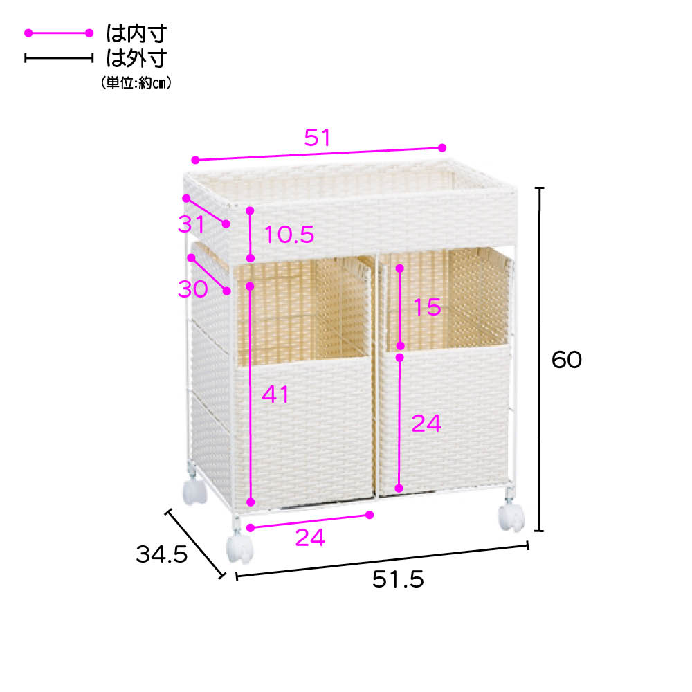 高さは約60cm。洗面台下のオープンスペースの収納としてもおすすめ。 ※お届けは2分別タイプです。