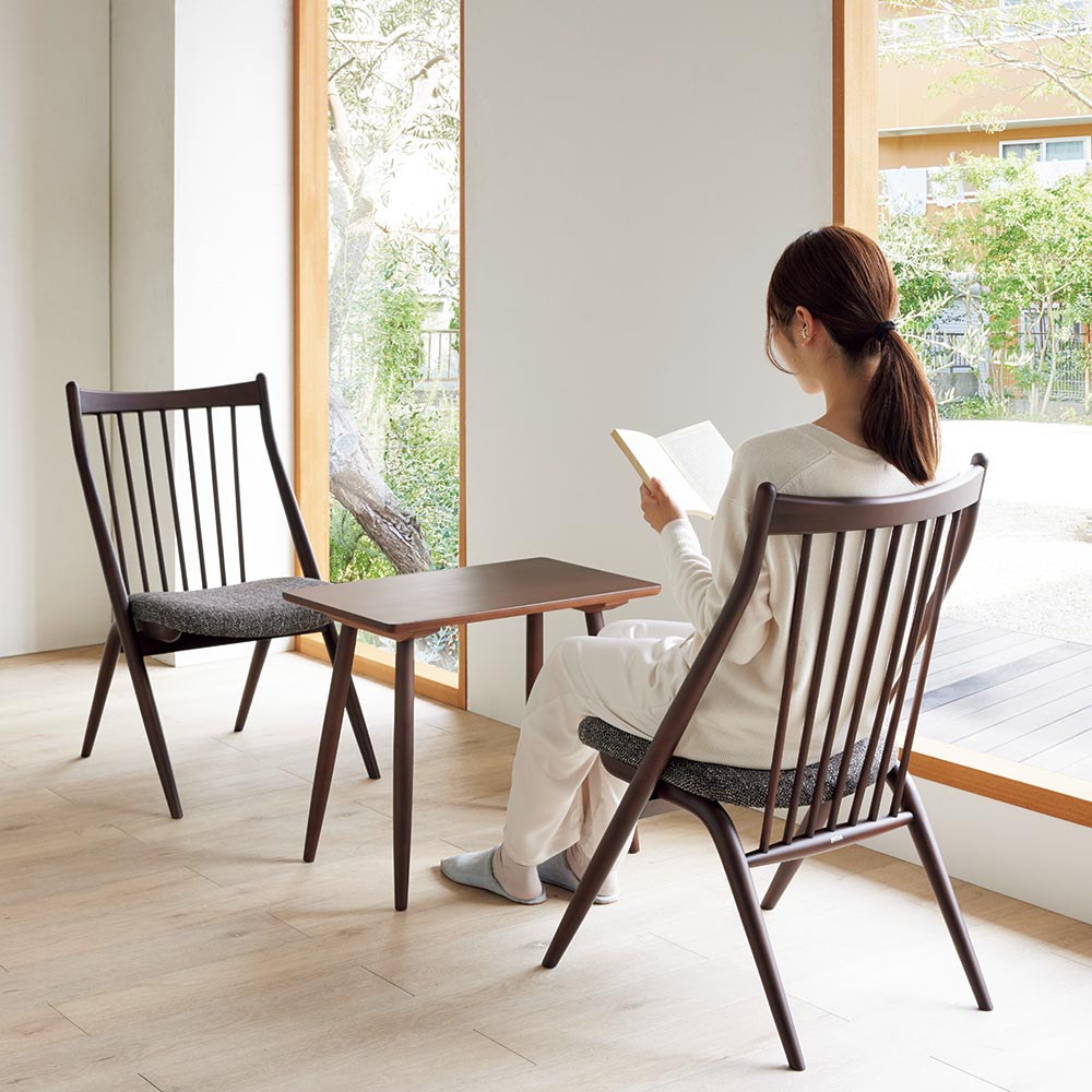 こちらの椅子は、1970年代の発売以来長く親しまれた「カスケードチェア」を、現代の暮らしにあわせてリデザイン。ダイニングチェアより少し低めの座高で、ゆったりと背中をあずけてくつろげます。例えば、窓辺で紅茶を飲む、リビングでお気に入りの本を開く、そんな、心がほどけていく自分だけのひとときのために。